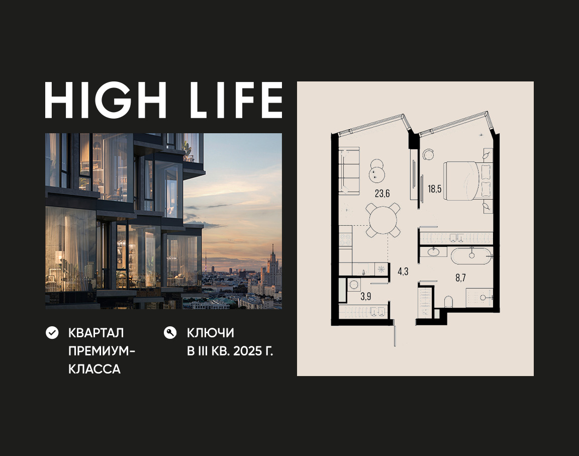 HIGH LIFE — премиальный проект компании PIONEER, расположенный в 5 минутах от Садового кольца, вблизи исторического Замоскворечья. Авторская архитектура от бюро ADM в стиле динамичного мегаполиса. 6 современных башен с яркими фасадами высотой от 24 до 47 этажей. Панорамные окна и изящные эркеры открывают виды на Кремль, МГУ, Москва-Сити, Дом Музыки и набережные реки. Сложившееся окружение Замоскворечья: от гастрономического изобилия ресторанов и баров до деловых кластеров и прогулочных зон с современными набережными. 2 стиля дизайнерской отделки на выбор: богатые текстуры камня в теплых тонах с черными контрастными элементами или акценты из латунно-золотистого хрома в сочетании с камнем крупных текстур.