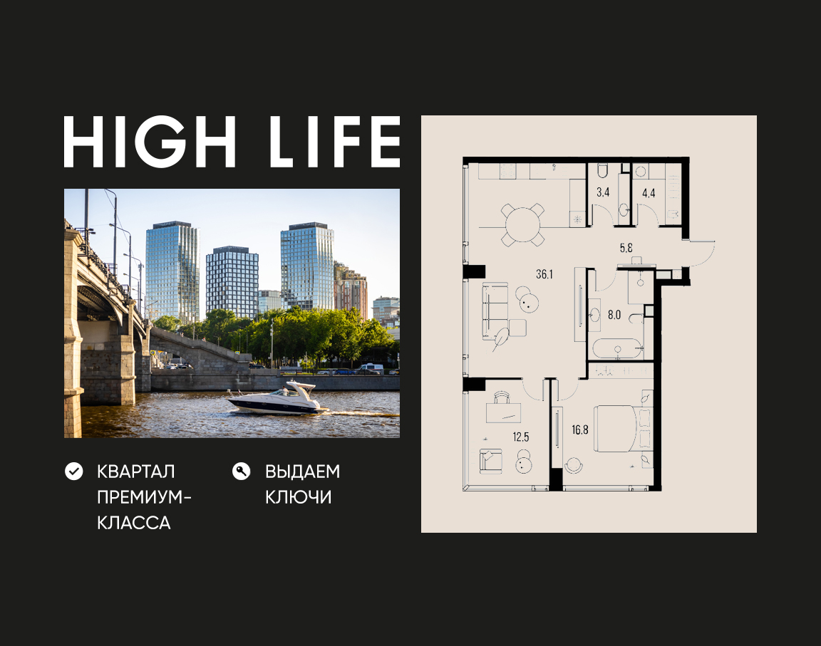 HIGH LIFE — премиальный проект компании PIONEER, расположенный в 5 минутах от Садового кольца, вблизи исторического Замоскворечья. Авторская архитектура от бюро ADM в стиле динамичного мегаполиса. 6 современных башен с яркими фасадами высотой от 24 до 47 этажей. Панорамные окна и изящные эркеры открывают виды на Кремль, МГУ, Москва-Сити, Дом Музыки и набережные реки. Сложившееся окружение Замоскворечья: от гастрономического изобилия ресторанов и баров до деловых кластеров и прогулочных зон с современными набережными. 2 стиля дизайнерской отделки на выбор: богатые текстуры камня в теплых тонах с черными контрастными элементами или акценты из латунно-золотистого хрома в сочетании с камнем крупных текстур.