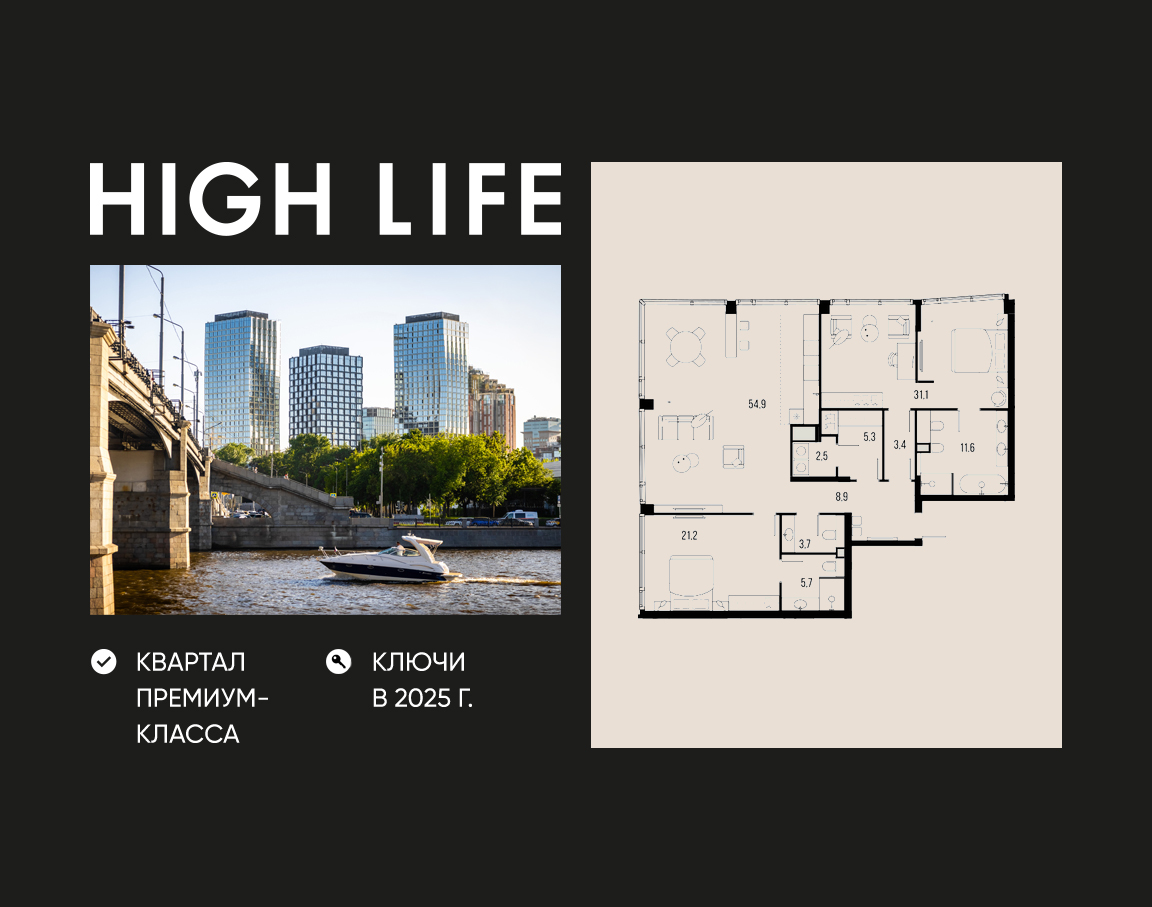 HIGH LIFE — премиальный проект компании PIONEER, расположенный в 5 минутах от Садового кольца, вблизи исторического Замоскворечья. Авторская архитектура от бюро ADM в стиле динамичного мегаполиса. 6 современных башен с яркими фасадами высотой от 24 до 47 этажей. Панорамные окна и изящные эркеры открывают виды на Кремль, МГУ, Москва-Сити, Дом Музыки и набережные реки. Сложившееся окружение Замоскворечья: от гастрономического изобилия ресторанов и баров до деловых кластеров и прогулочных зон с современными набережными. 2 стиля дизайнерской отделки на выбор: богатые текстуры камня в теплых тонах с черными контрастными элементами или акценты из латунно-золотистого хрома в сочетании с камнем крупных текстур.