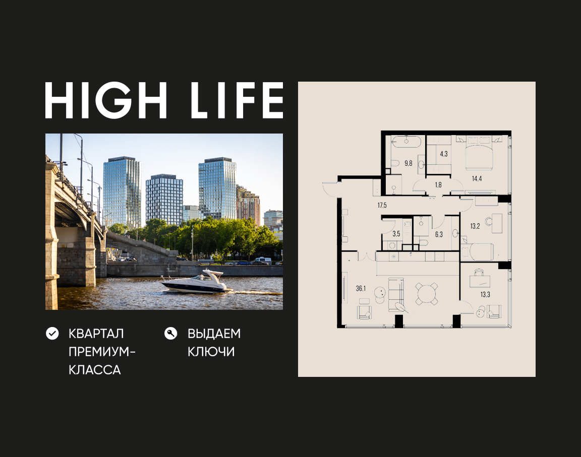 HIGH LIFE — премиальный проект компании PIONEER, расположенный в 5 минутах от Садового кольца, вблизи исторического Замоскворечья. Авторская архитектура от бюро ADM в стиле динамичного мегаполиса. 6 современных башен с яркими фасадами высотой от 24 до 47 этажей. Панорамные окна и изящные эркеры открывают виды на Кремль, МГУ, Москва-Сити, Дом Музыки и набережные реки. Сложившееся окружение Замоскворечья: от гастрономического изобилия ресторанов и баров до деловых кластеров и прогулочных зон с современными набережными. 2 стиля дизайнерской отделки на выбор: богатые текстуры камня в теплых тонах с черными контрастными элементами или акценты из латунно-золотистого хрома в сочетании с камнем крупных текстур.