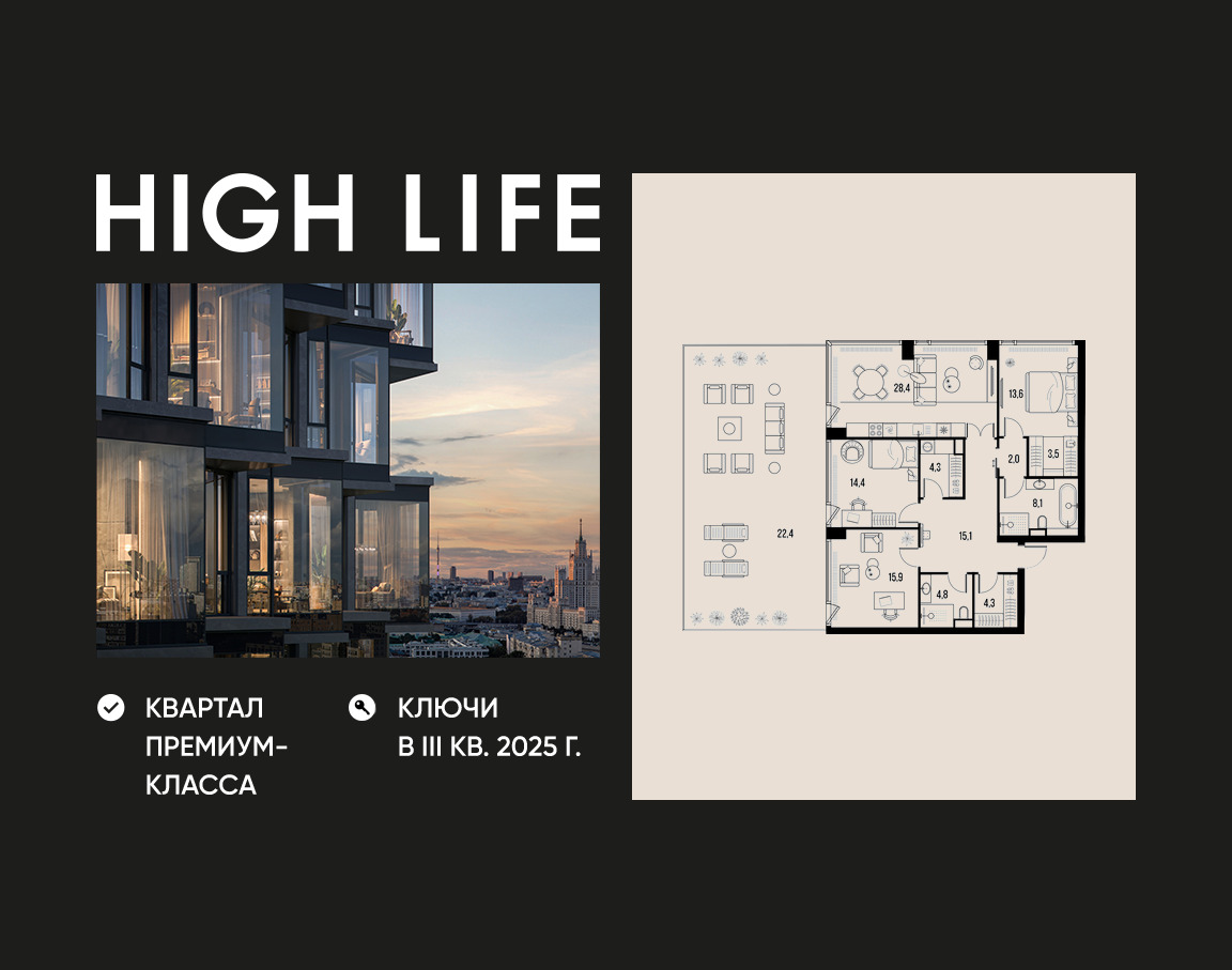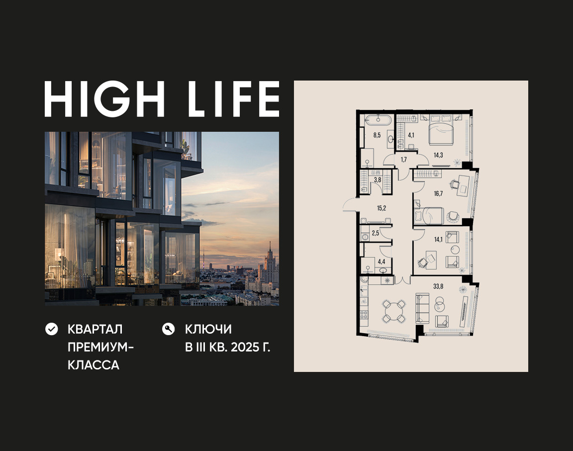 HIGH LIFE — премиальный проект компании PIONEER, расположенный в 5 минутах от Садового кольца, вблизи исторического Замоскворечья. Авторская архитектура от бюро ADM в стиле динамичного мегаполиса. 6 современных башен с яркими фасадами высотой от 24 до 47 этажей. Панорамные окна и изящные эркеры открывают виды на Кремль, МГУ, Москва-Сити, Дом Музыки и набережные реки. Сложившееся окружение Замоскворечья: от гастрономического изобилия ресторанов и баров до деловых кластеров и прогулочных зон с современными набережными. 2 стиля дизайнерской отделки на выбор: богатые текстуры камня в теплых тонах с черными контрастными элементами или акценты из латунно-золотистого хрома в сочетании с камнем крупных текстур.