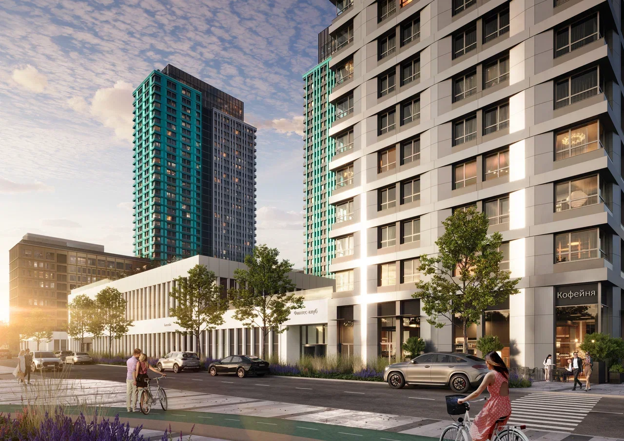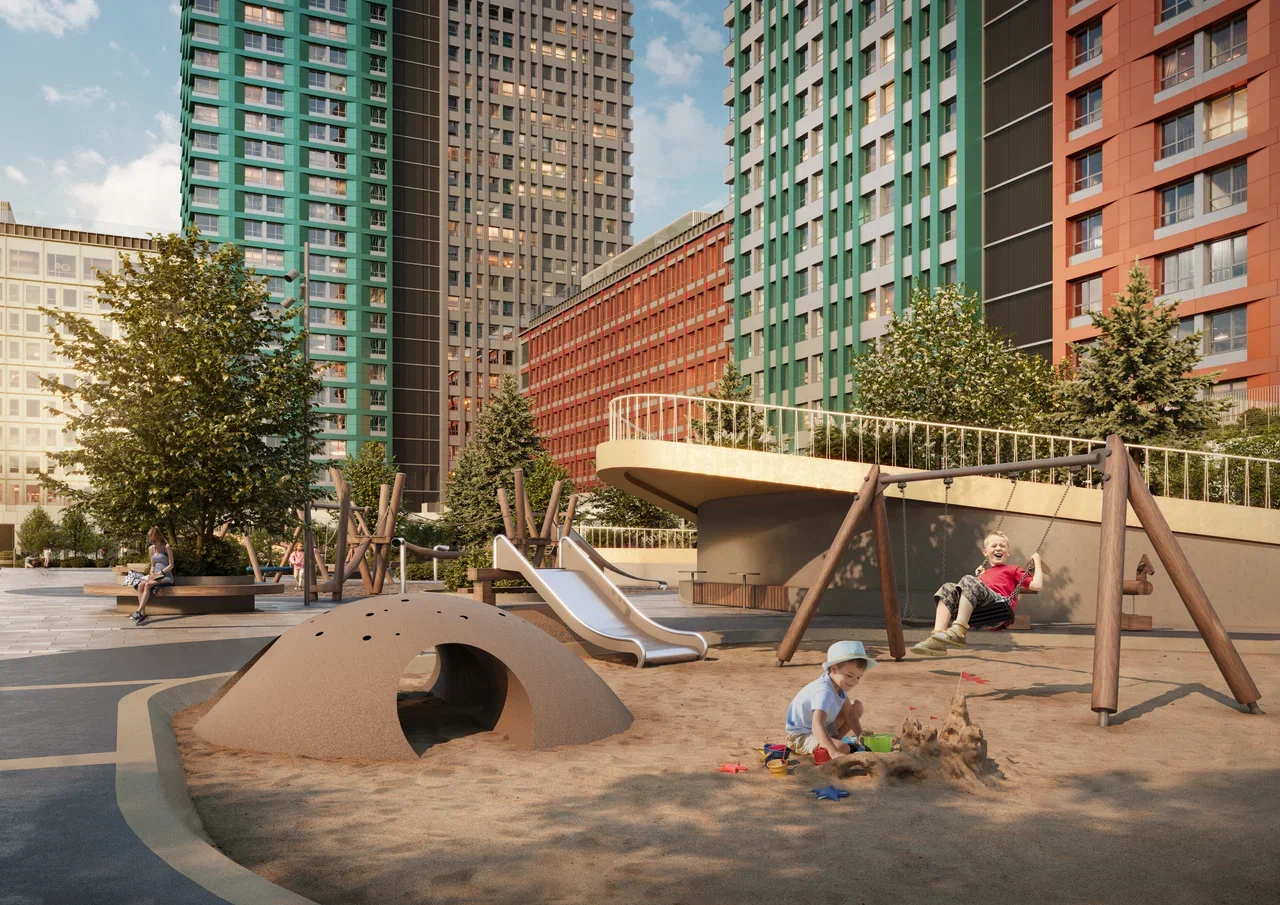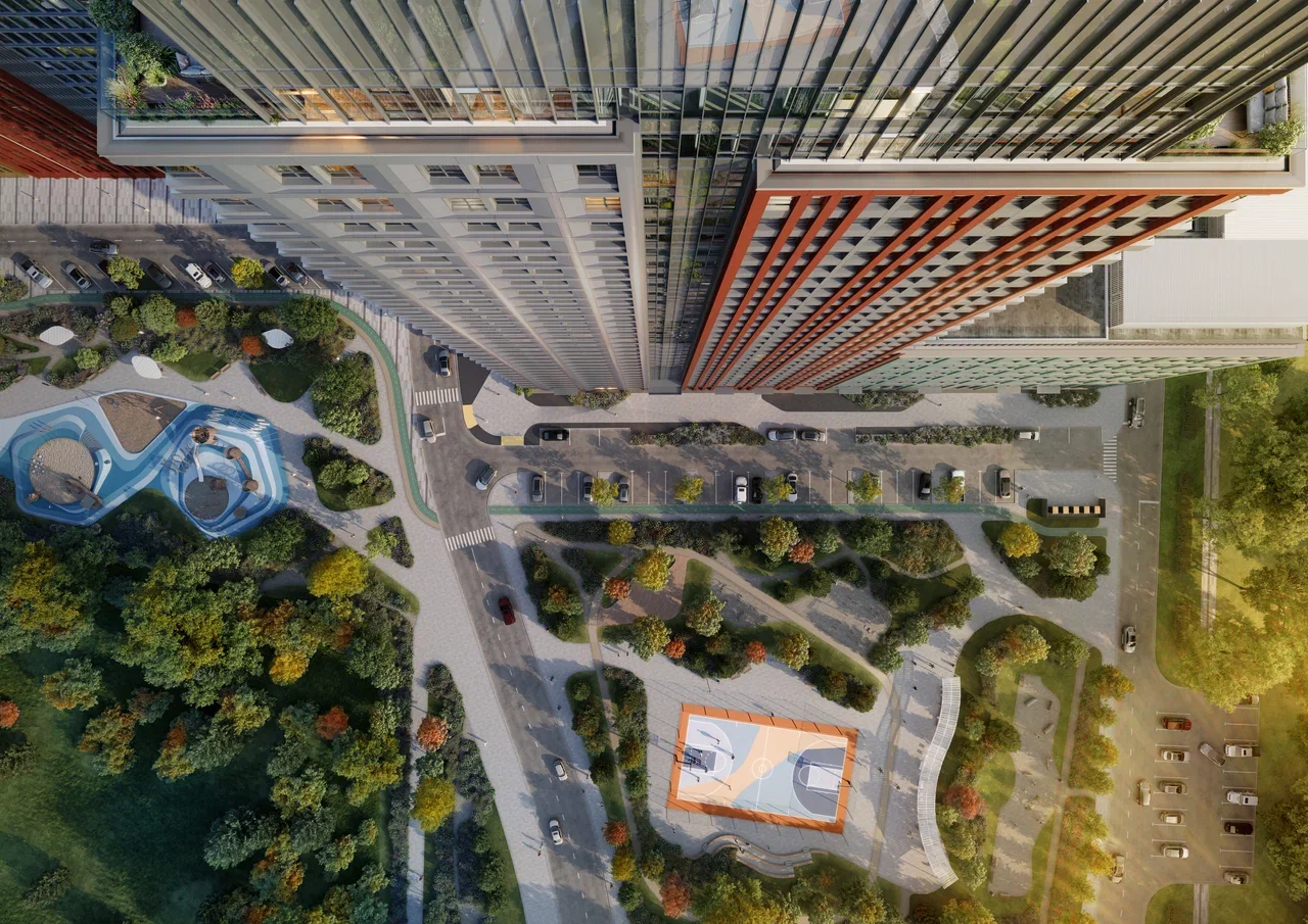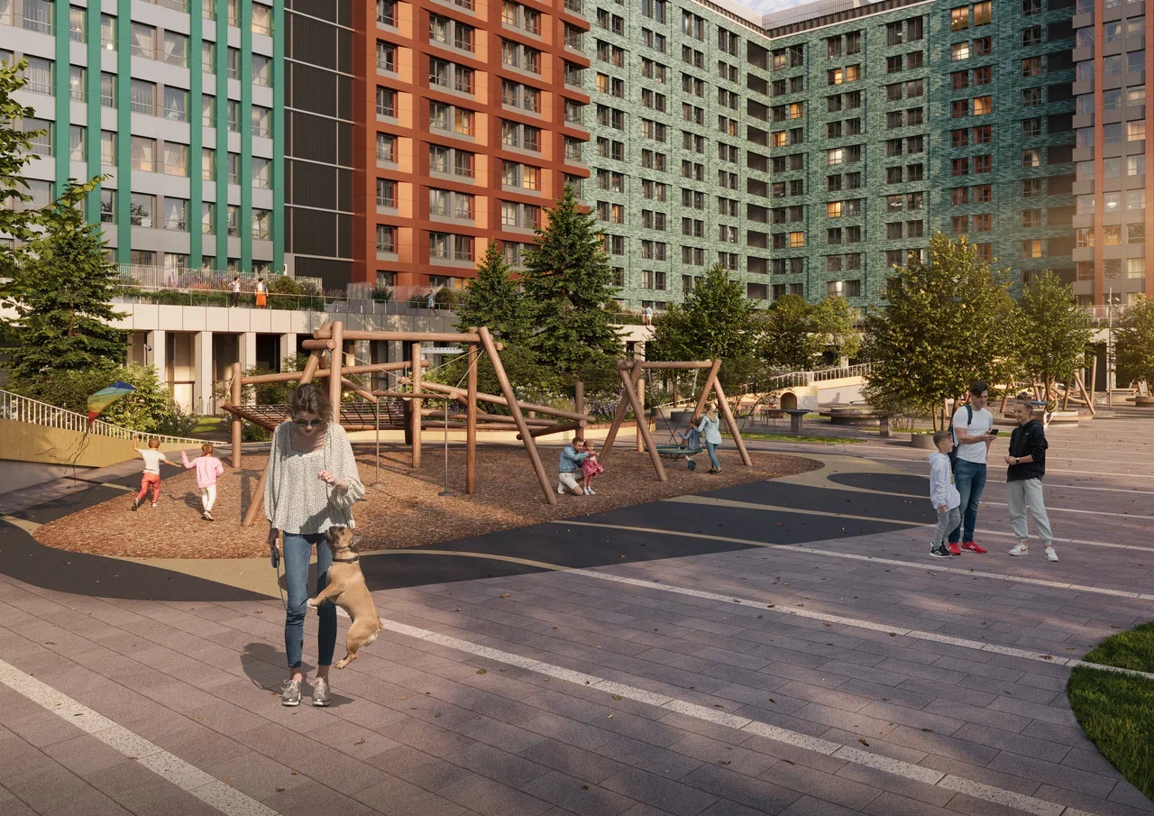 В закрытом внутреннем дворе площадью 8000 м2 обустроены три детские площадки и воркаут‑зона. По периметру двора, на втором уровне, идет променад – ещё одно зелёное пространство с местами для отдыха и работы.