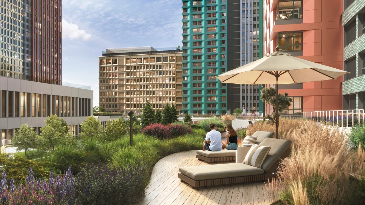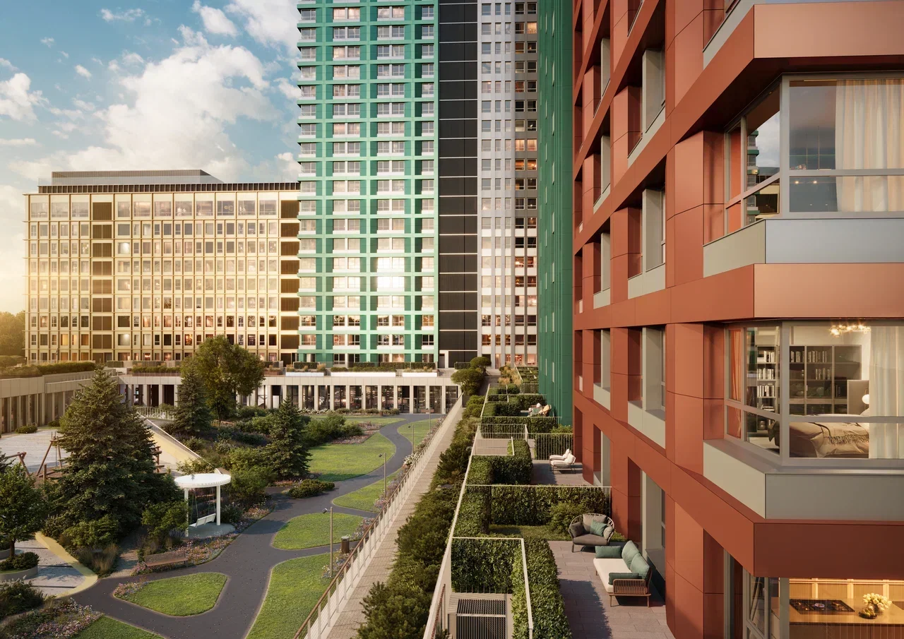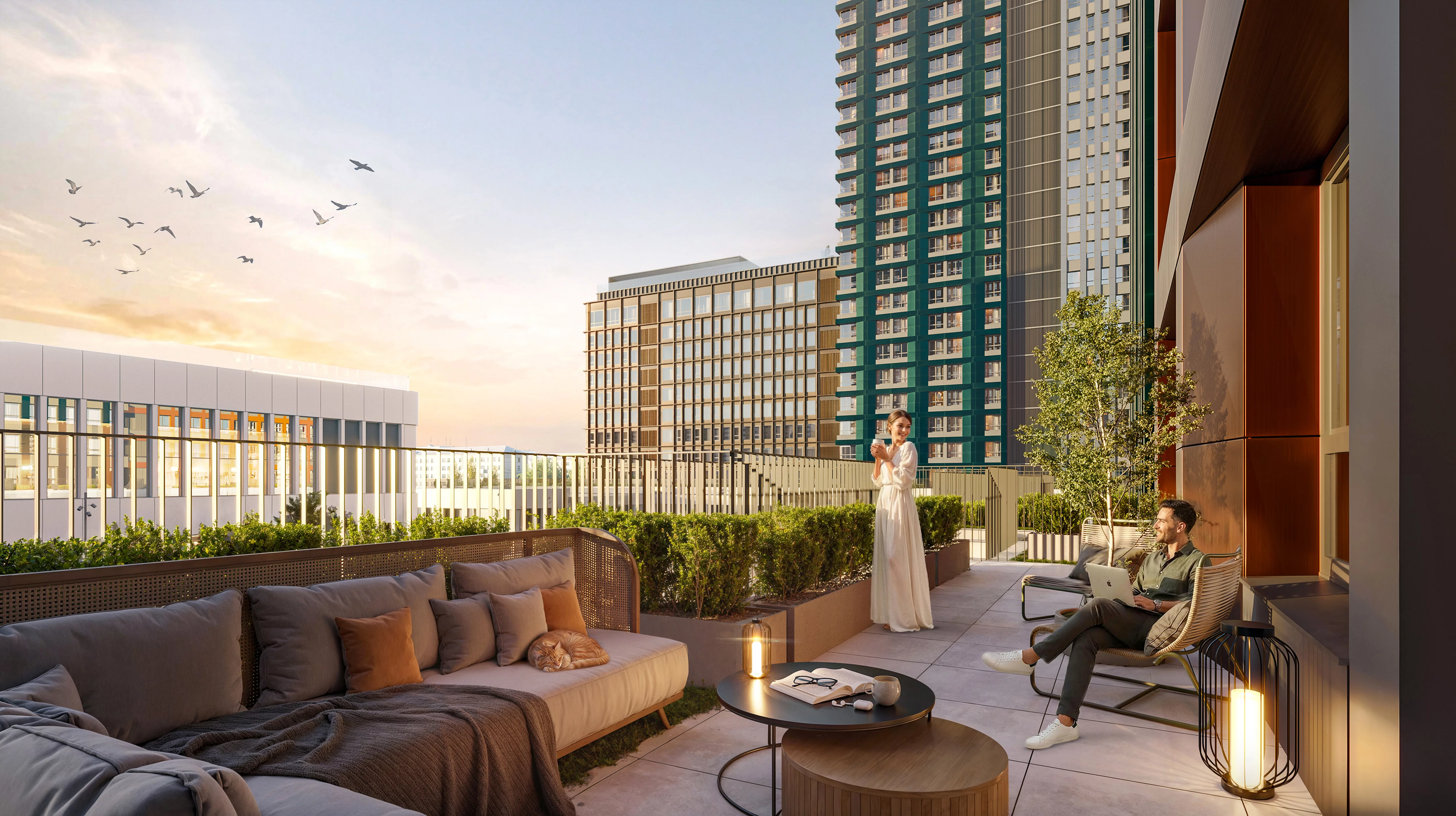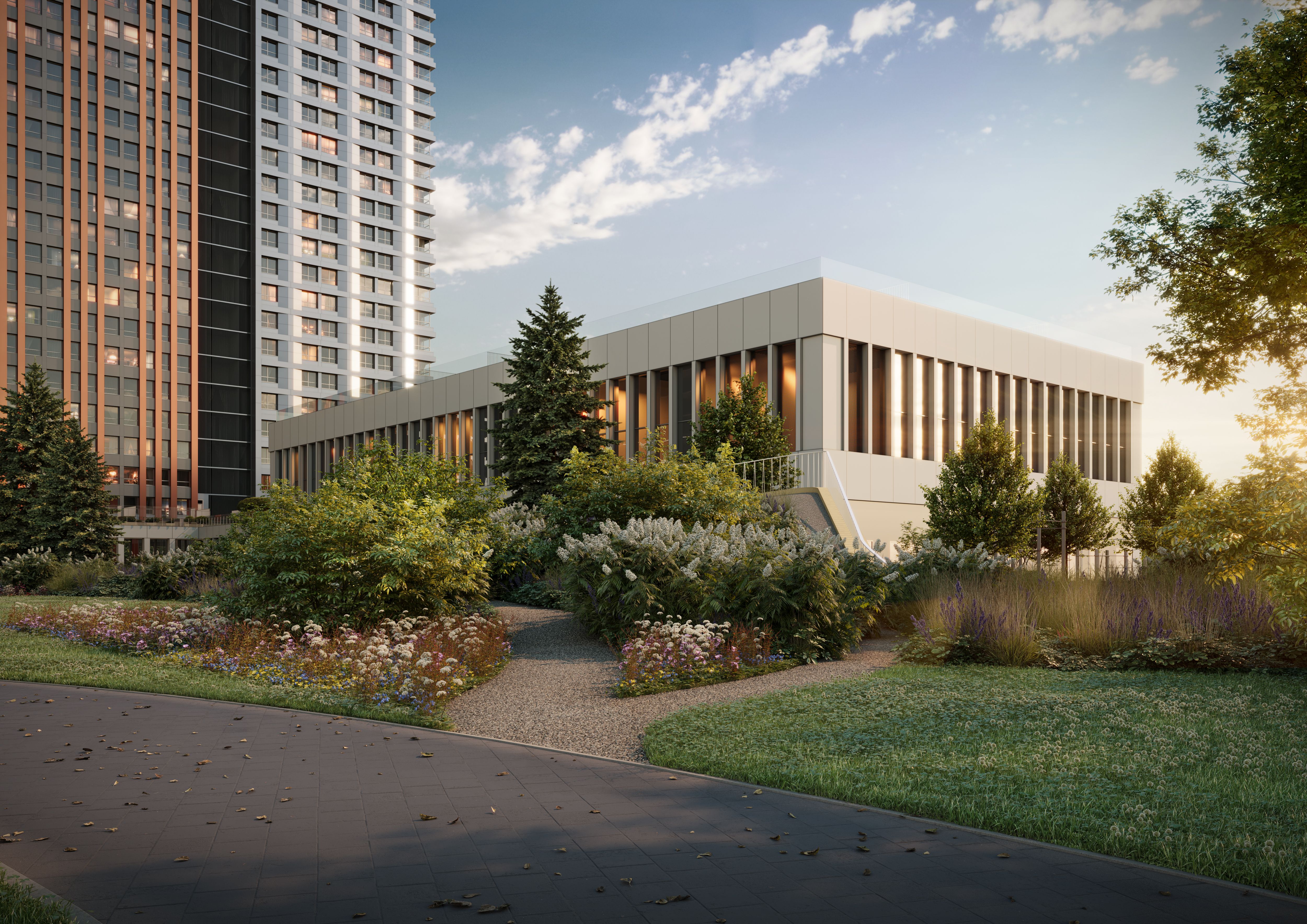 В закрытом внутреннем дворе площадью 8000 м2 обустроены три детские площадки и воркаут‑зона. По периметру двора, на втором уровне, идет променад – ещё одно зелёное пространство с местами для отдыха и работы.