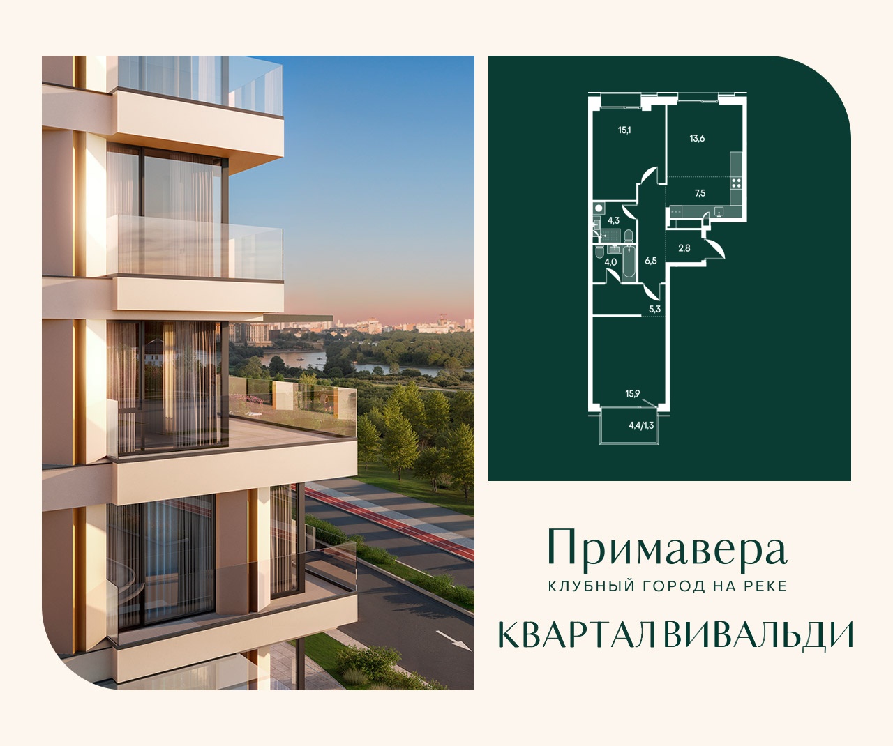 Покупателям предлагается большой выбор квартир — от стандартных планировок до жилья со своим входом, патио и собственными террасами. Также есть двухуровневые квартиры и пентхаусы. Из большинства окон открывается панорамный вид на парки и реку. Общая площадь застройки составит 280 000 кв. м. Площадь квартир — от 40 до 192 кв. м.