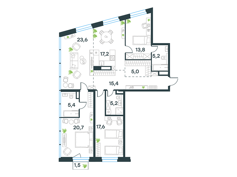 Предусмотрено более 40 видов продуманных планировок — от студий (20 кв. м.) до пятикомнатных евроформата (131 кв. м.). Кроме того, в комплексе будут представлены такие редкие форматы, как квартиры с окном в ванной и с высокими потолками до 4,22 м. Покупателям предлагаются три варианта отделки: черновая, white box с основой для собственного интерьера или готовый дизайнерский ремонт в одном из двух стилей.