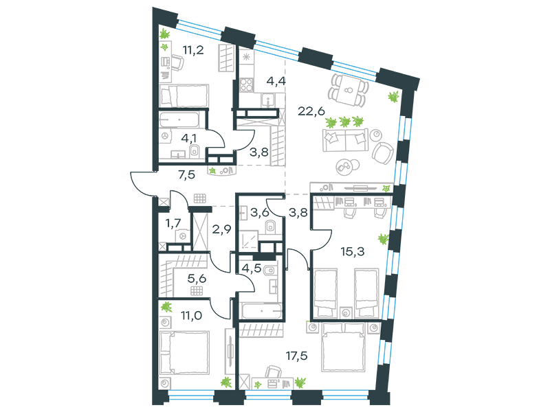 Предусмотрено более 40 видов продуманных планировок — от студий (20 кв. м.) до пятикомнатных евроформата (131 кв. м.). Кроме того, в комплексе будут представлены такие редкие форматы, как квартиры с окном в ванной и с высокими потолками до 4,22 м. Покупателям предлагаются три варианта отделки: черновая, white box с основой для собственного интерьера или готовый дизайнерский ремонт в одном из двух стилей.