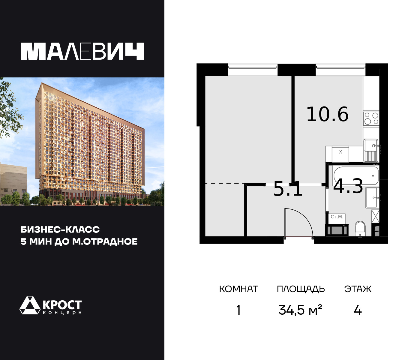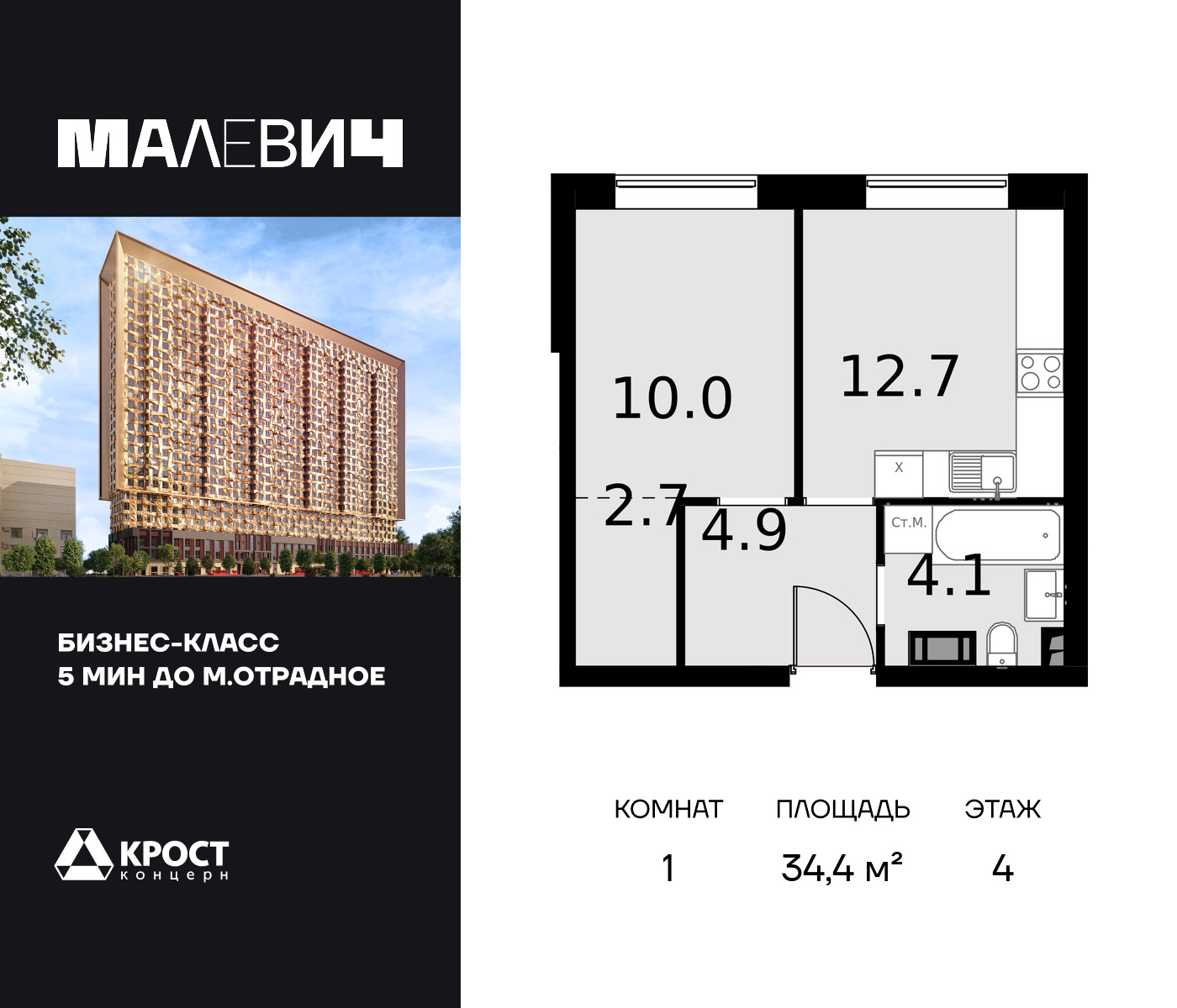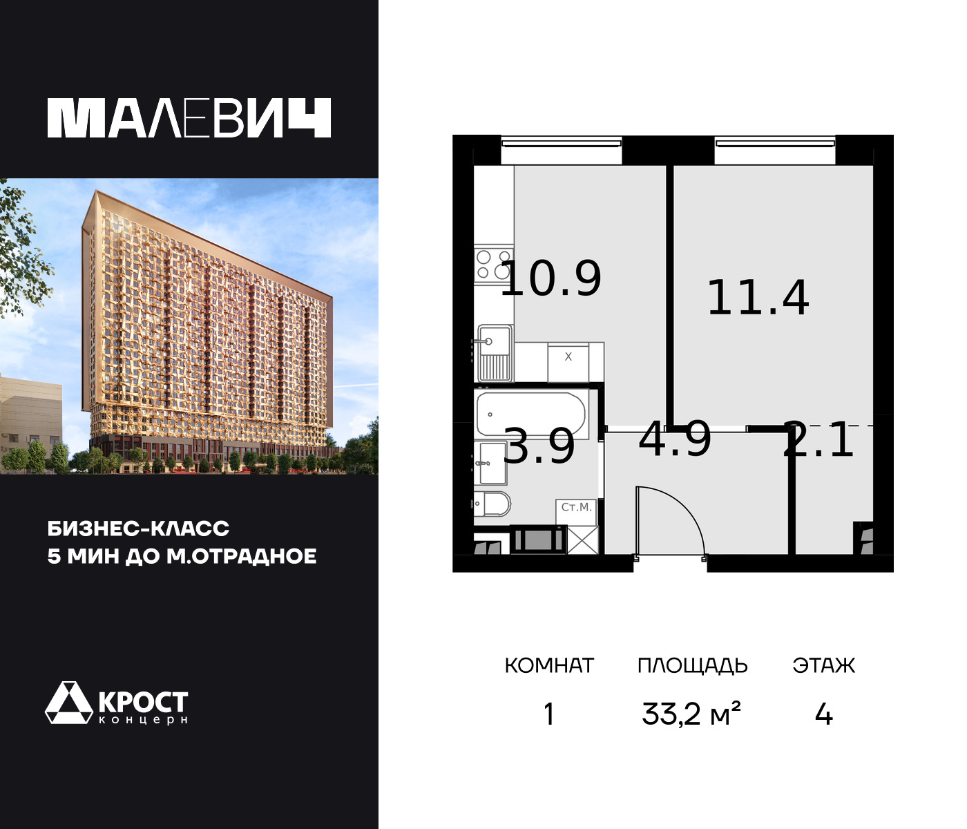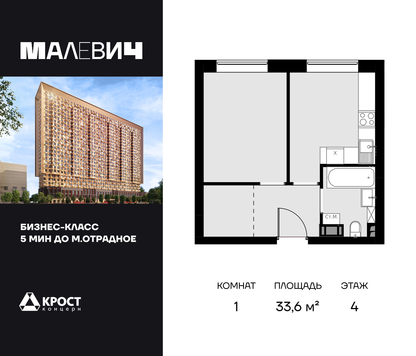 Однокомнатные квартиры в Дом MALEVICH (Малевич)
