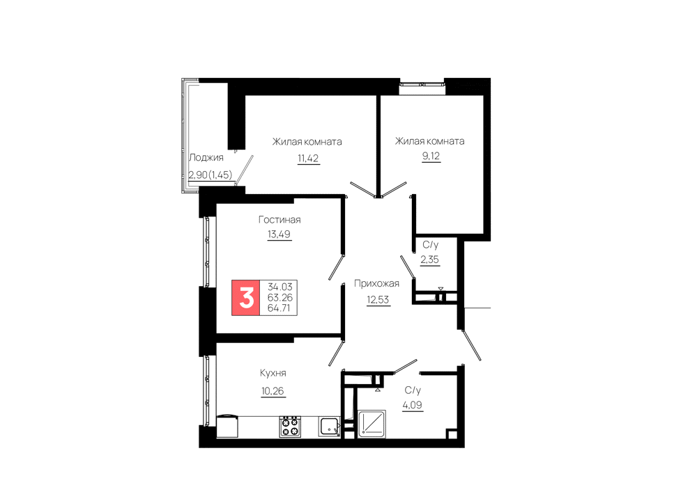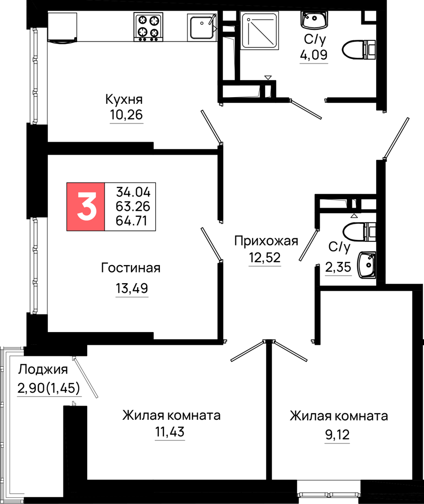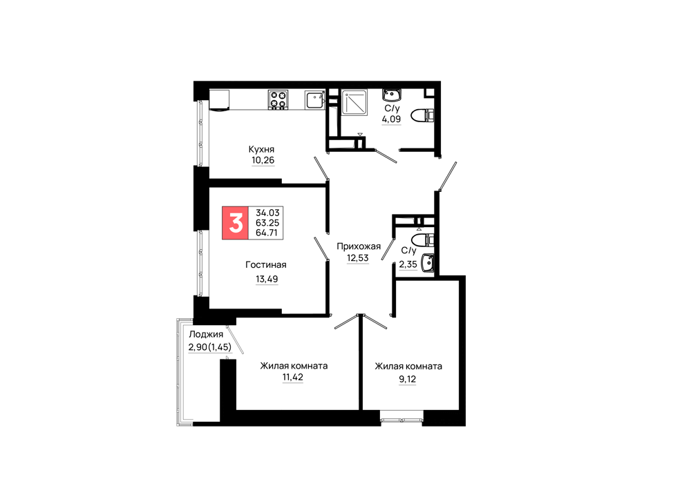 3-комнатная (64.71м2)