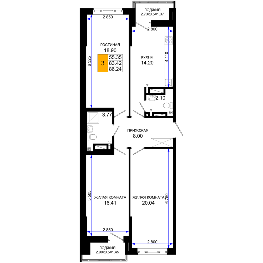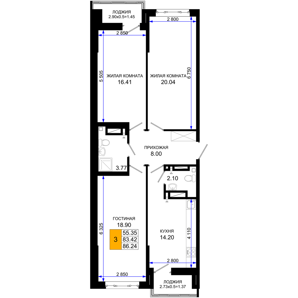 3-комнатная (86.24м2)
