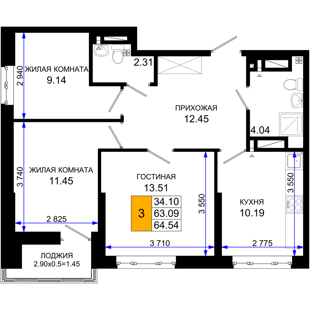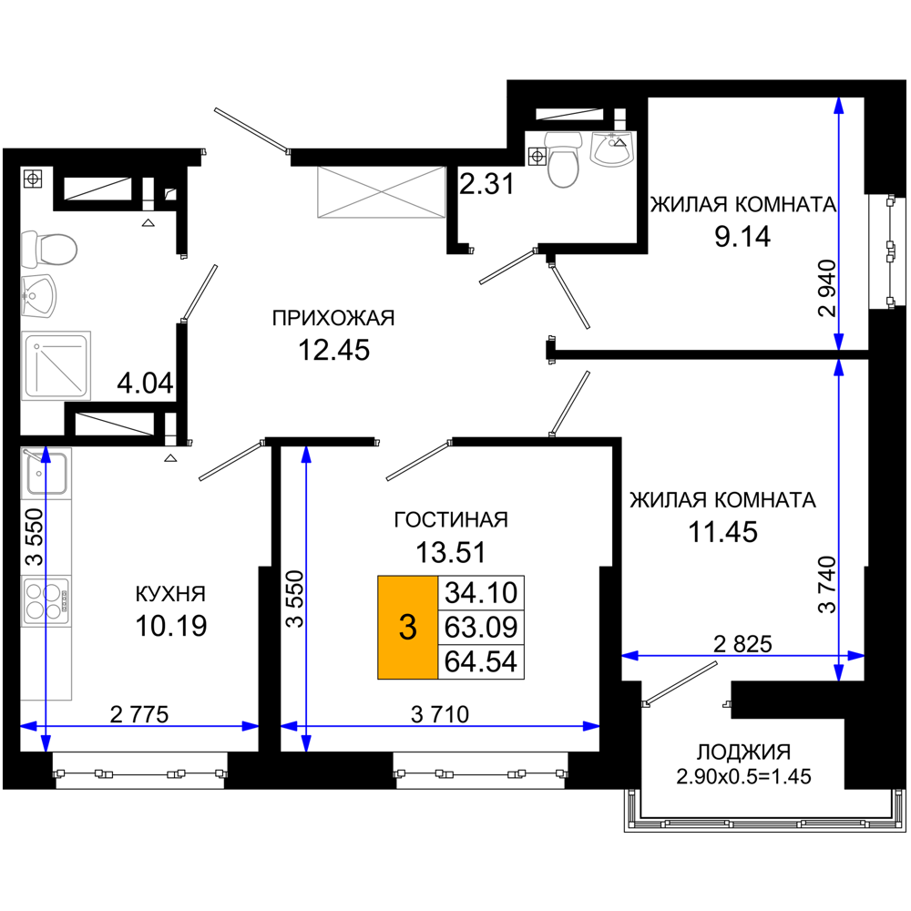 3-комнатная (64.54м2)