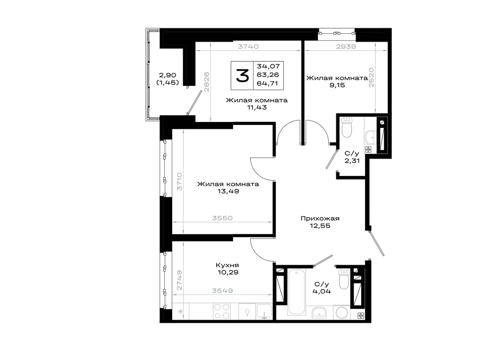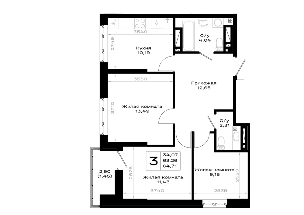 3-комнатная (64.71м2)