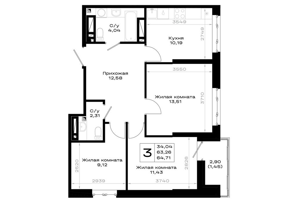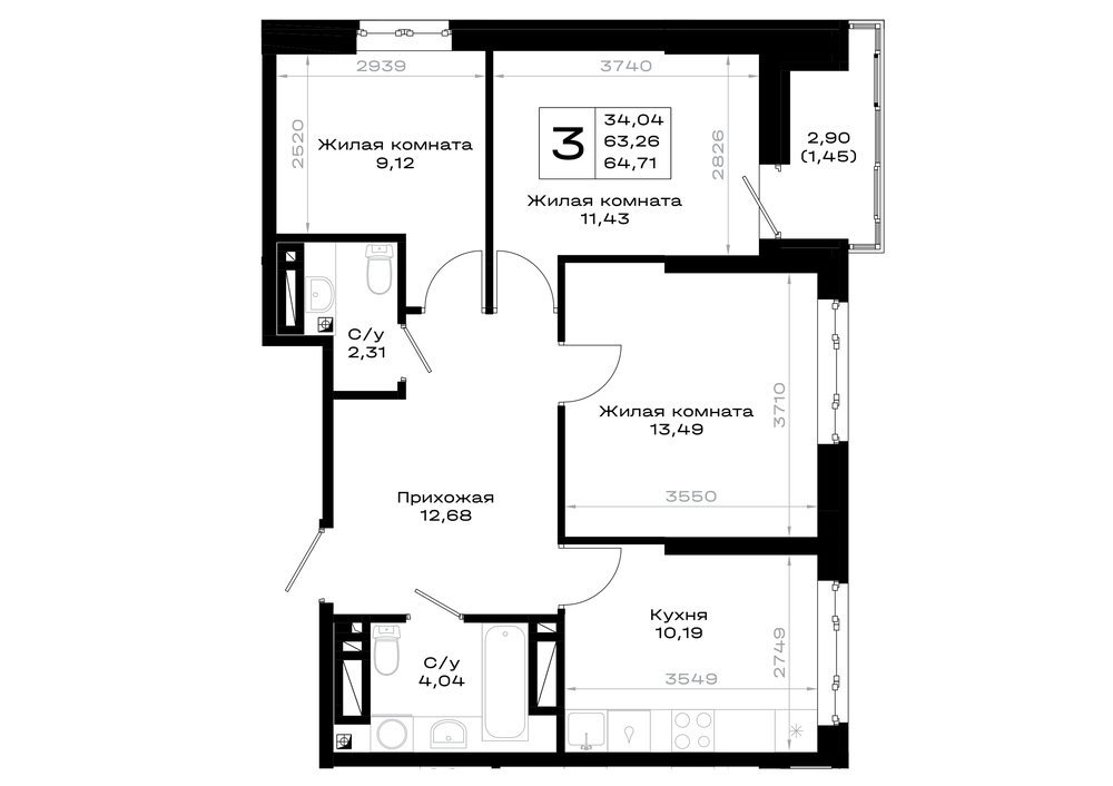 3-комнатная (64.7м2)