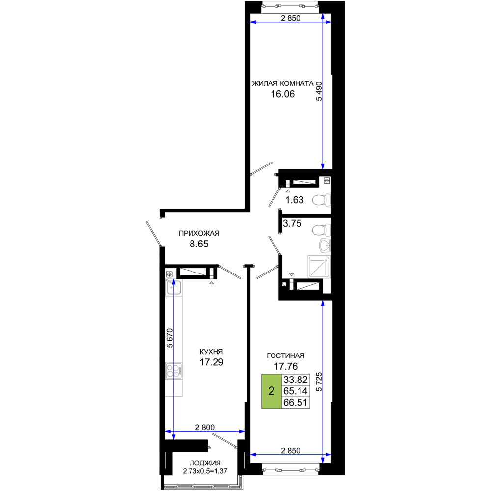 Евро 2-комнатная (66.51м2)