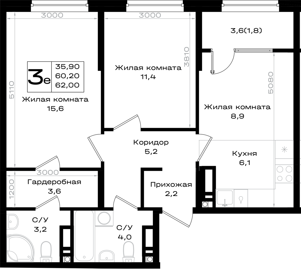 3-комнатная (62м2)