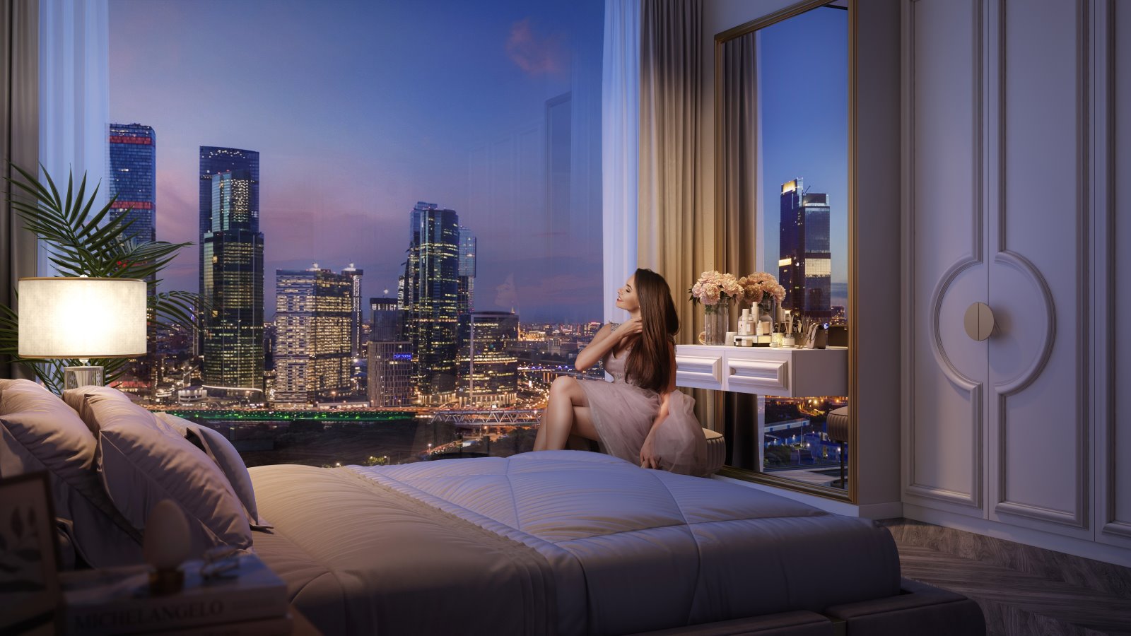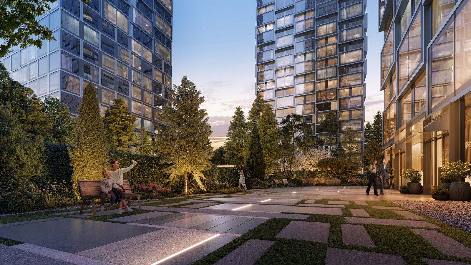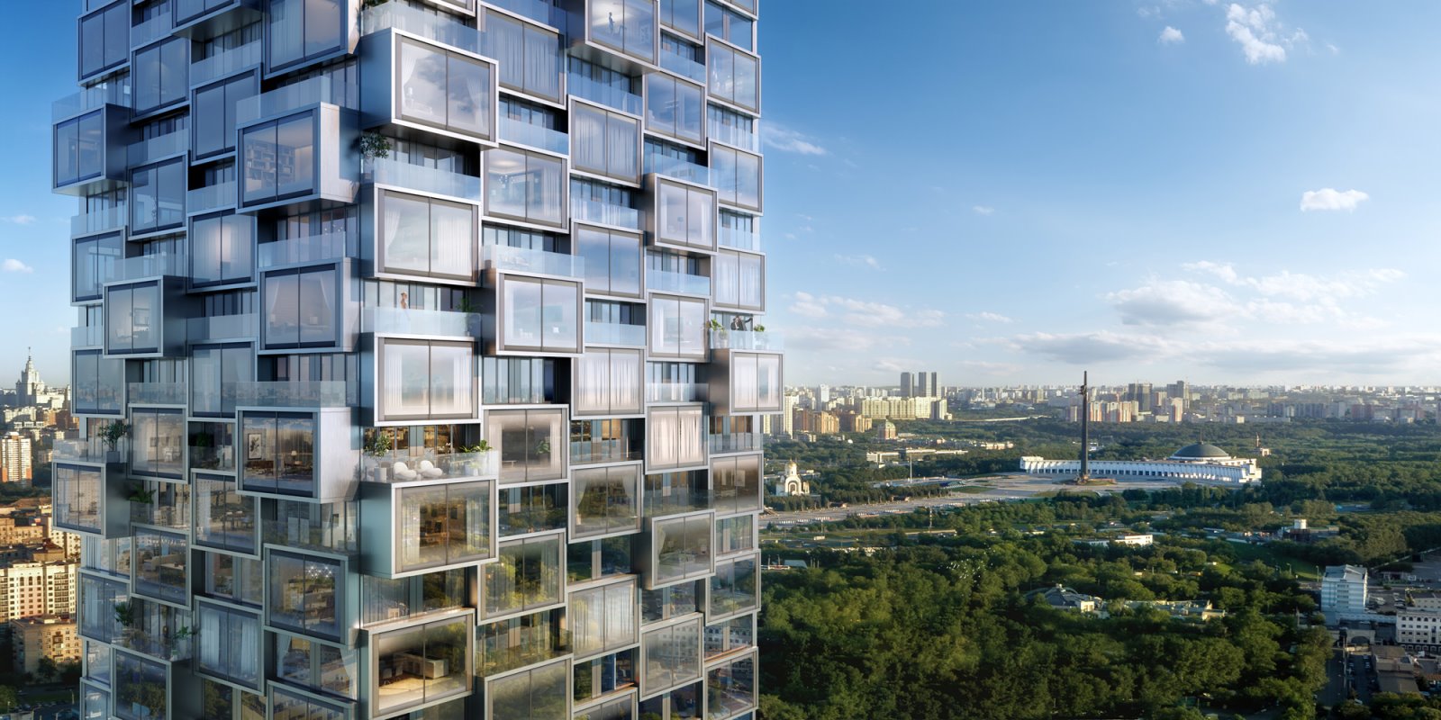 Архитектура от именитого бюро ADM отличается уникальной пластикой фасадов: башни словно парят в воздухе, играя гранями, как драгоценные камни. Жилой комплекс состоит из пяти небоскрёбов с приватным парком площадью 2 га и внешней торговой галереей с открытым доступом.