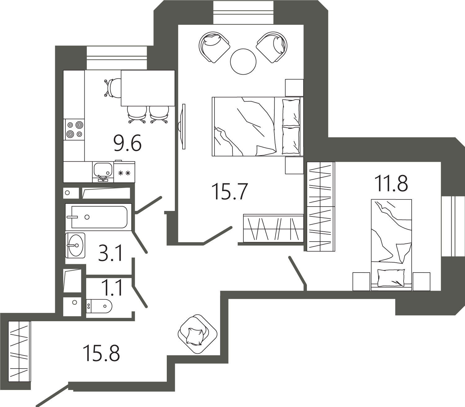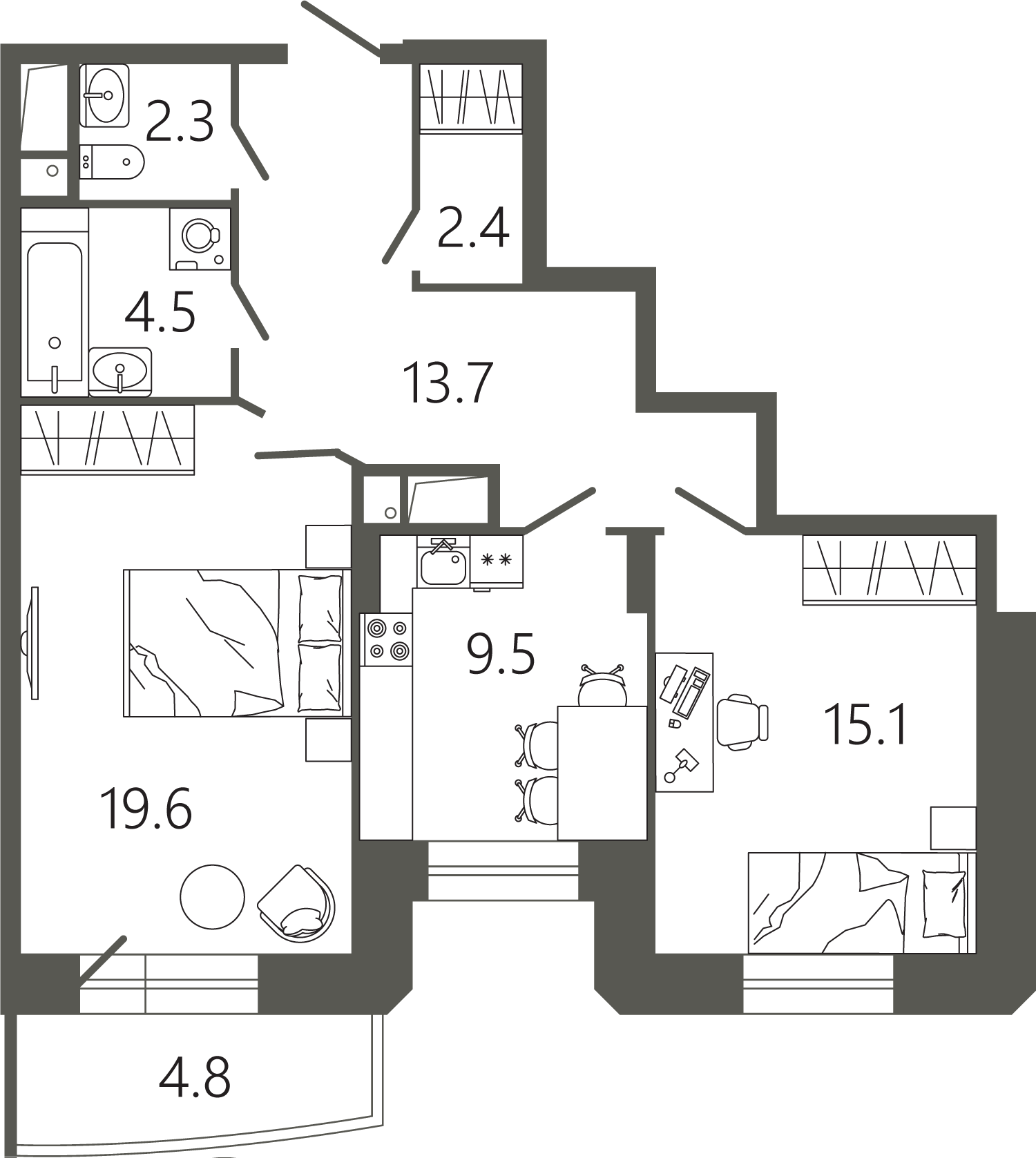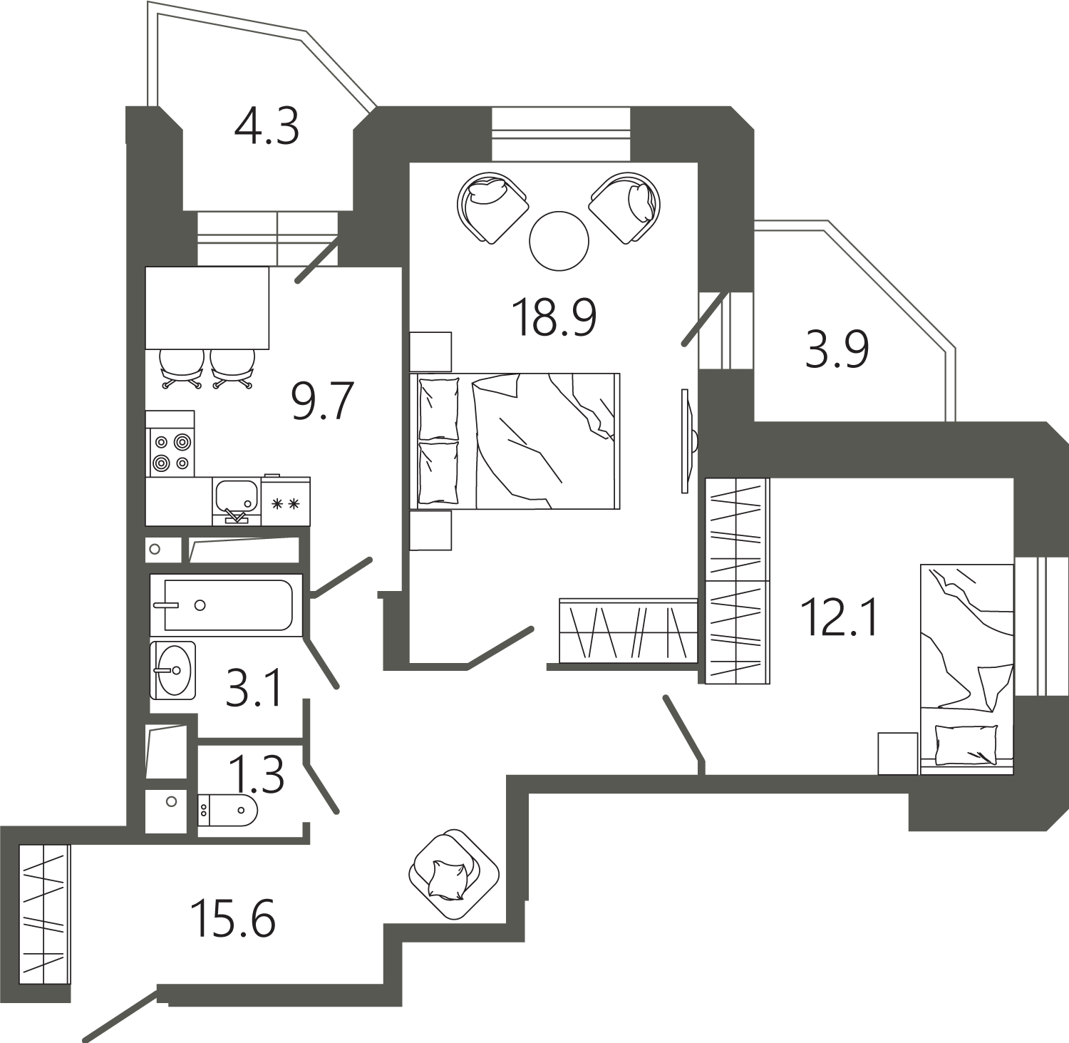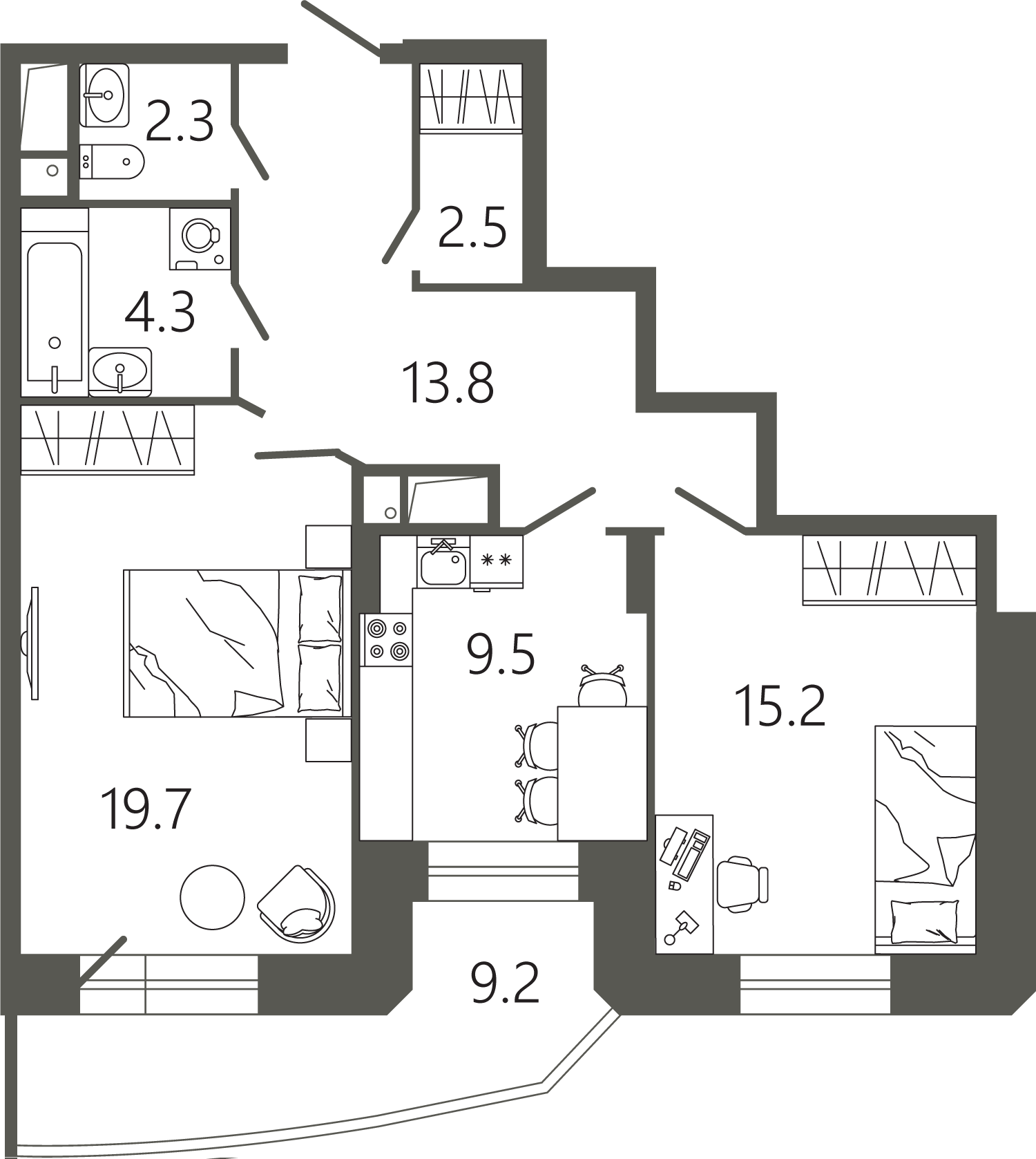 Просторные квартиры с одной, двумя и тремя комнатами, площадью от 45 до 97 кв. м, с тщательно продуманными планировками для максимальной эффективности использования пространства. Функциональность планировок позволяет максимально использовать пространство: кухня просторная, а холл может быть оформлен как гардеробная комната.