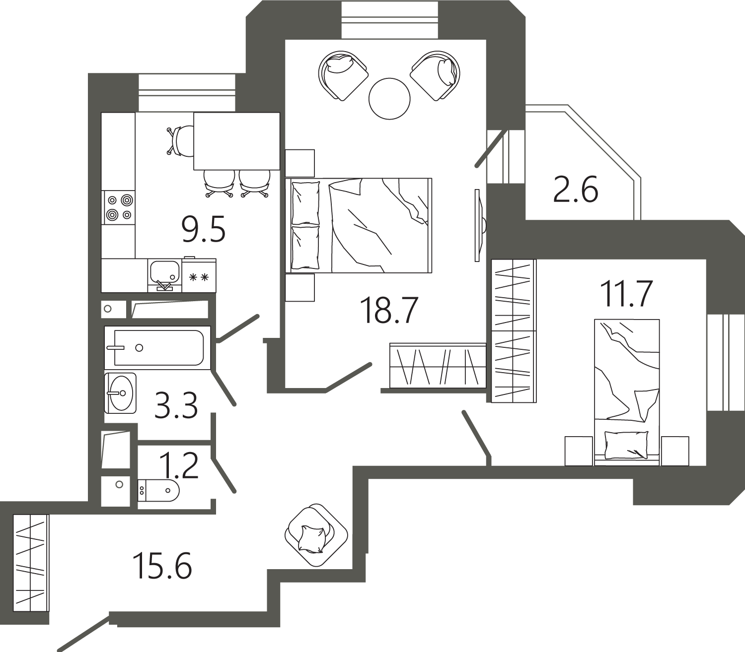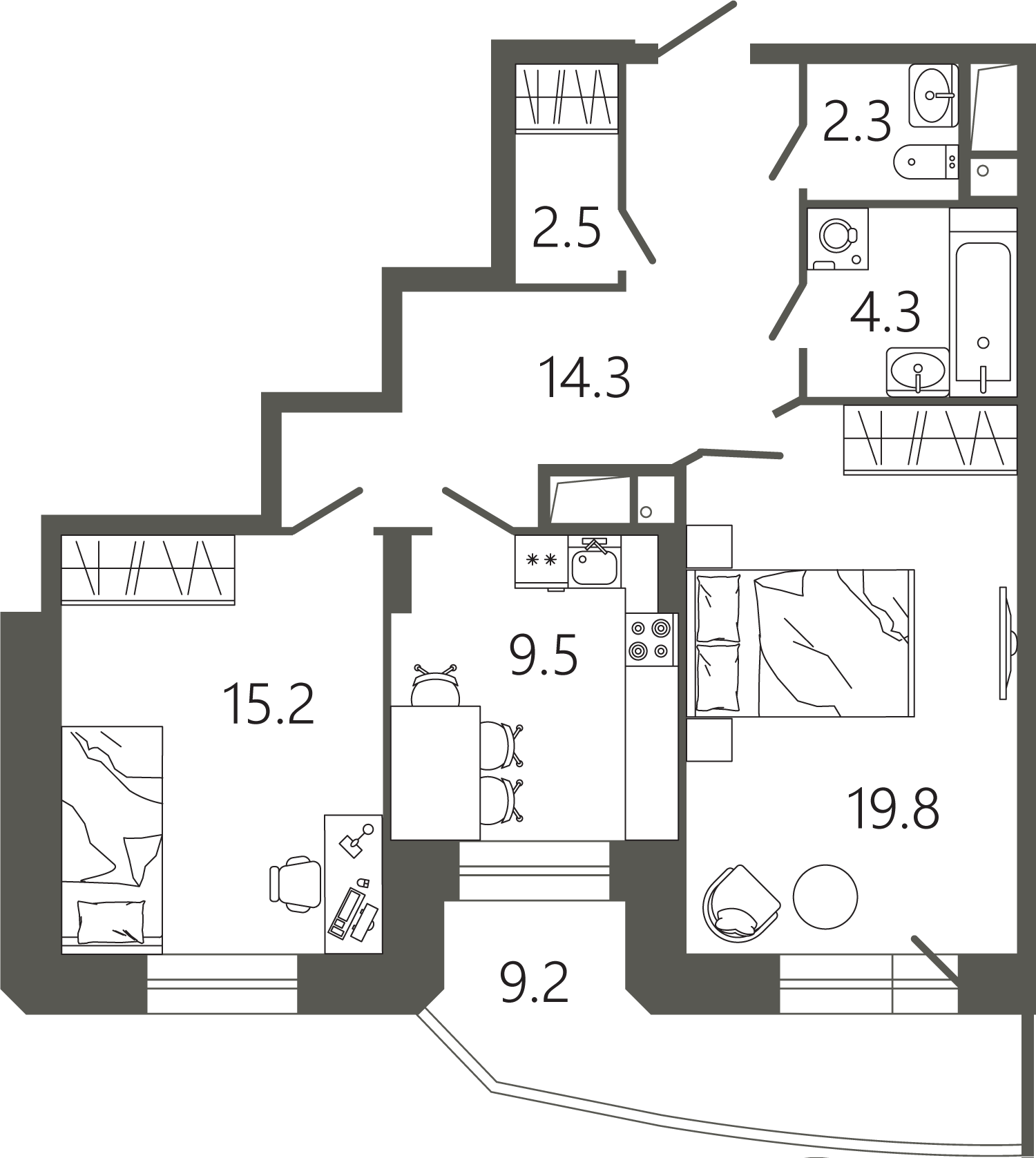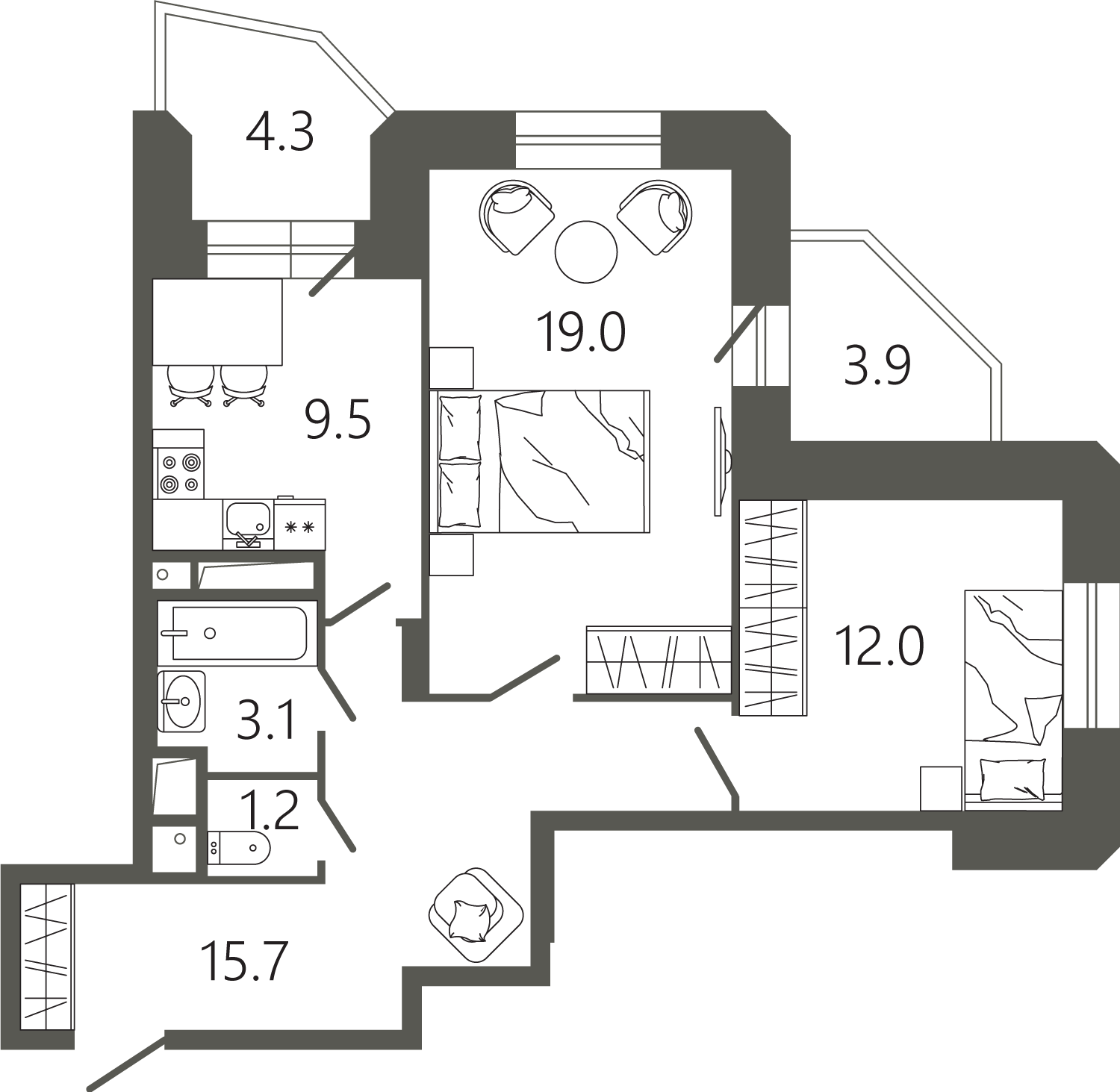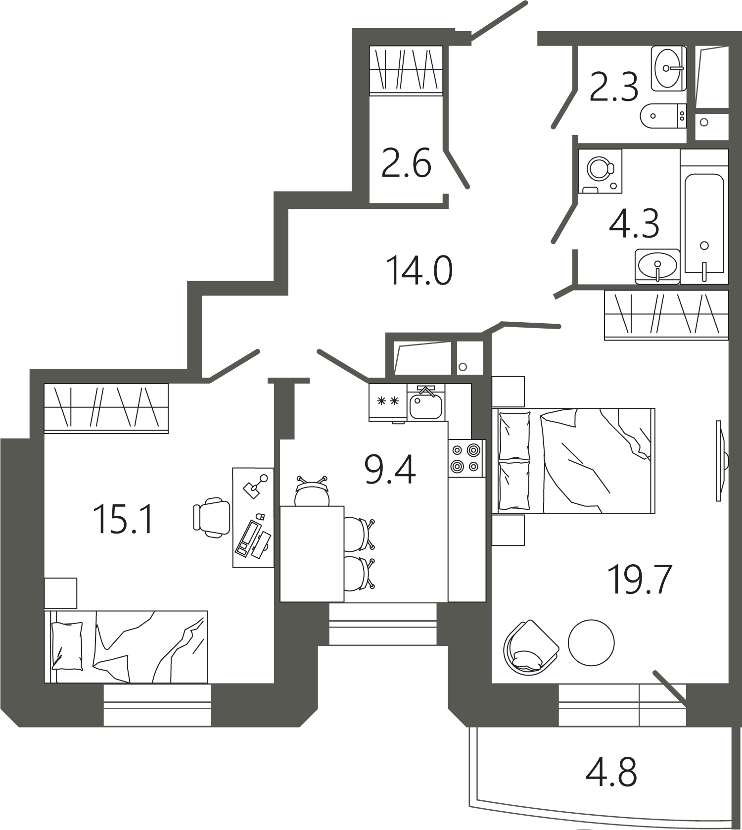 Просторные квартиры с одной, двумя и тремя комнатами, площадью от 45 до 97 кв. м, с тщательно продуманными планировками для максимальной эффективности использования пространства. Функциональность планировок позволяет максимально использовать пространство: кухня просторная, а холл может быть оформлен как гардеробная комната.