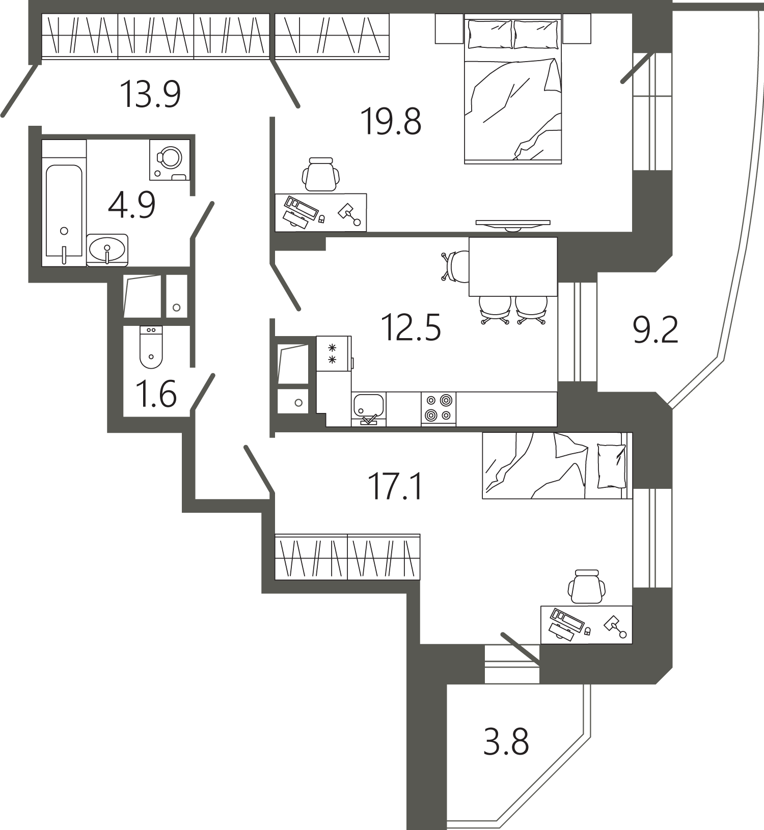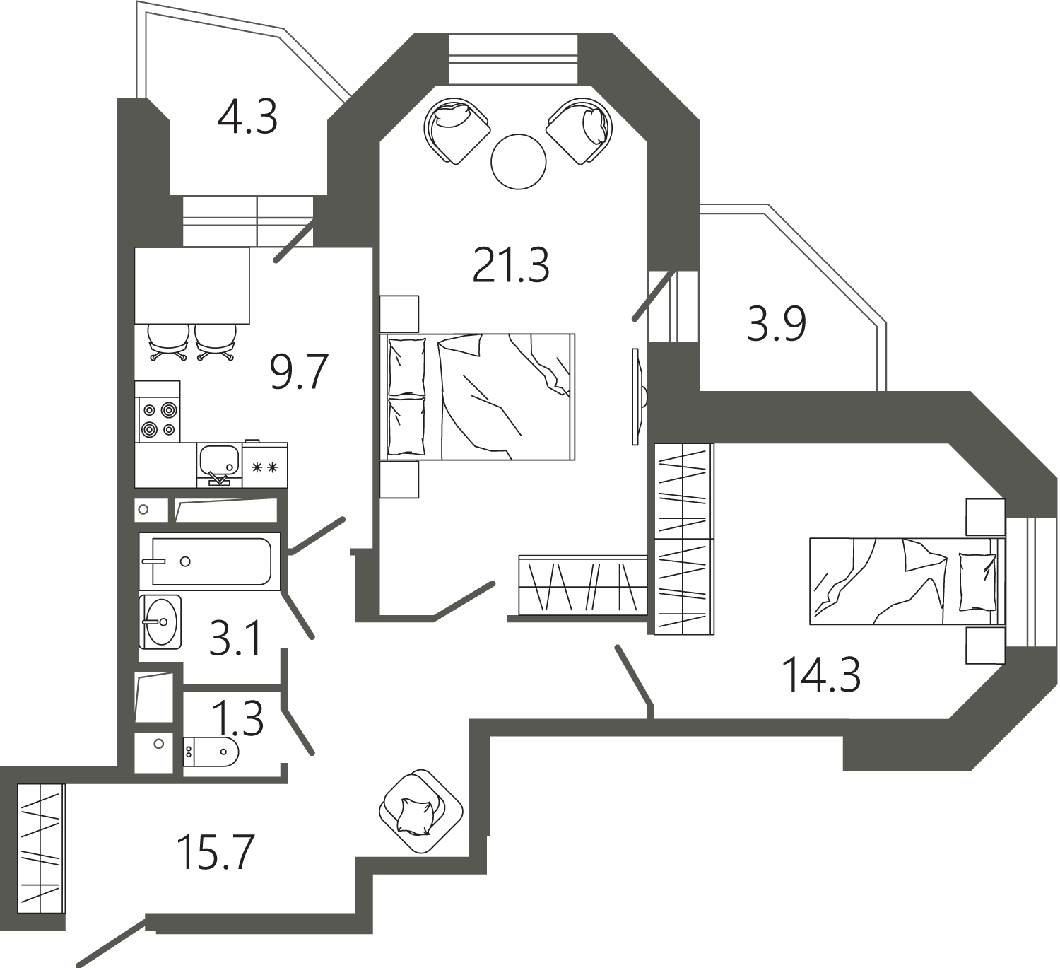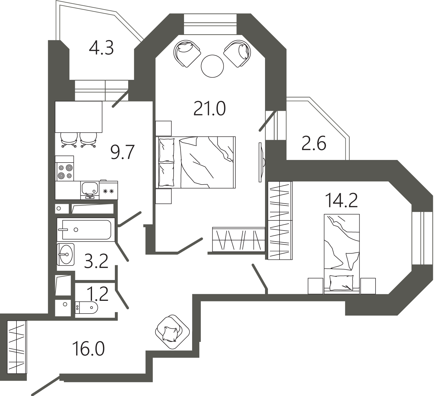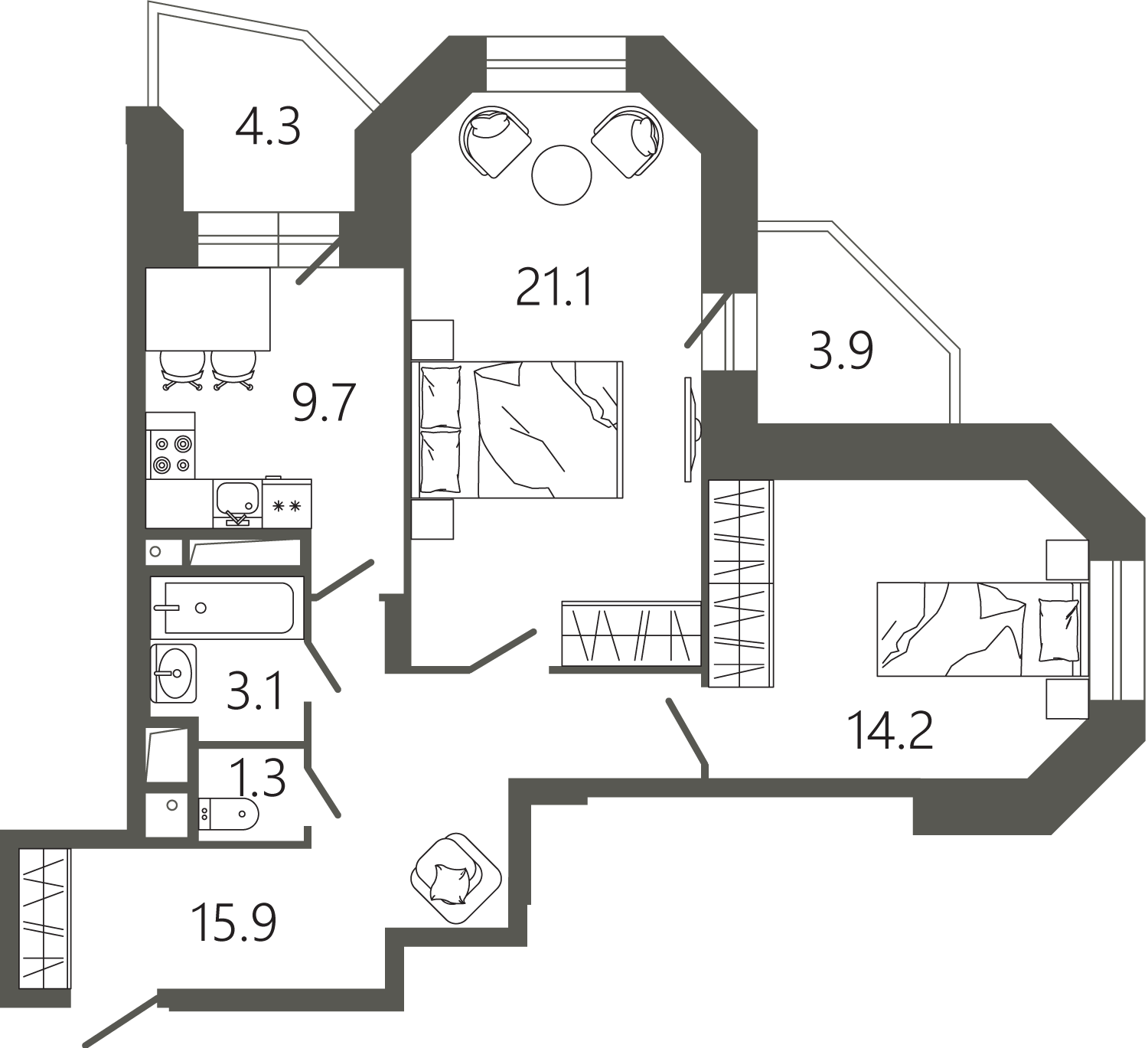 Просторные квартиры с одной, двумя и тремя комнатами, площадью от 45 до 97 кв. м, с тщательно продуманными планировками для максимальной эффективности использования пространства. Функциональность планировок позволяет максимально использовать пространство: кухня просторная, а холл может быть оформлен как гардеробная комната.