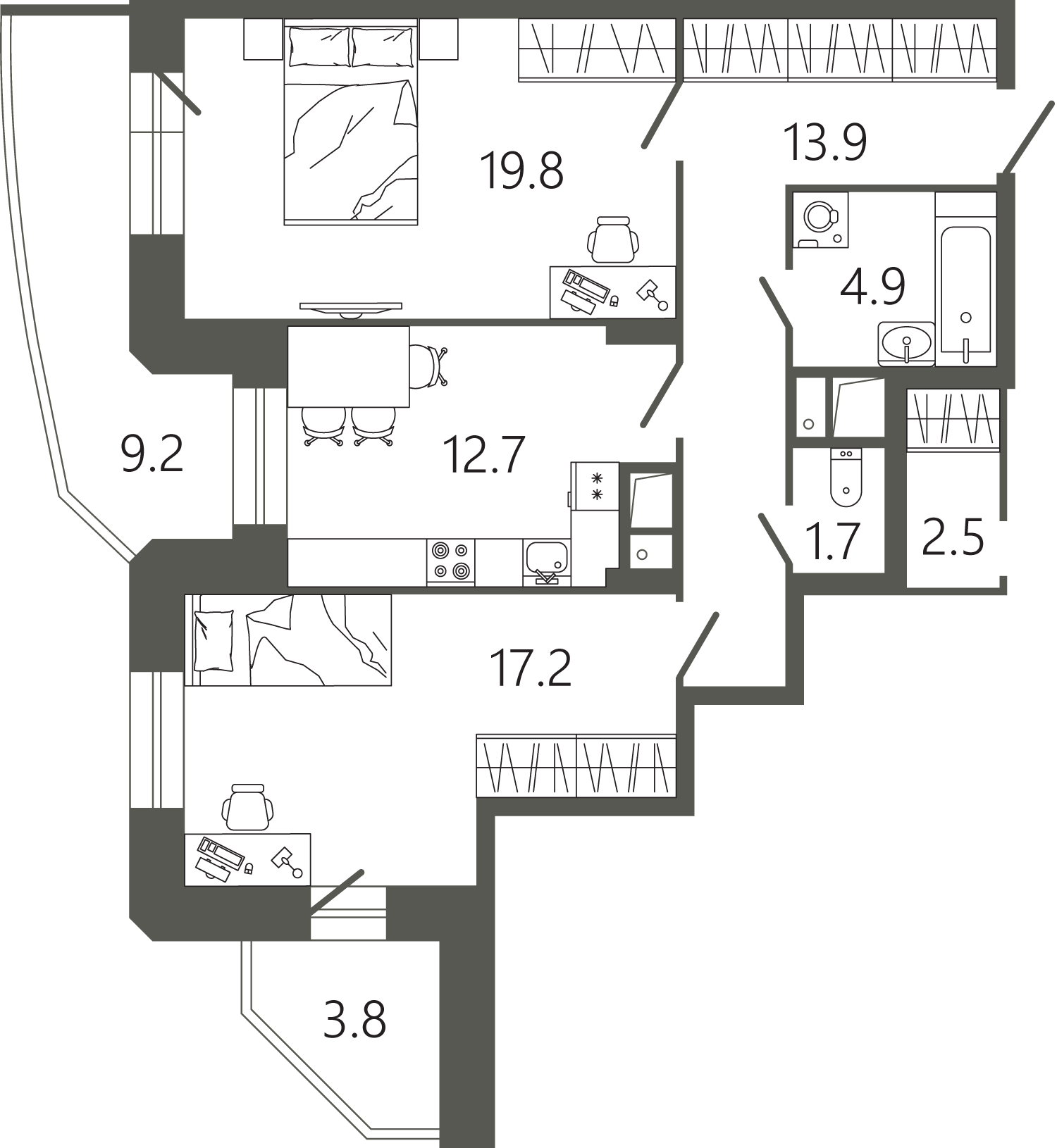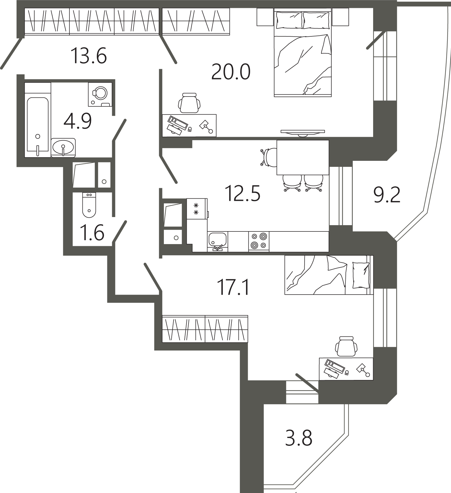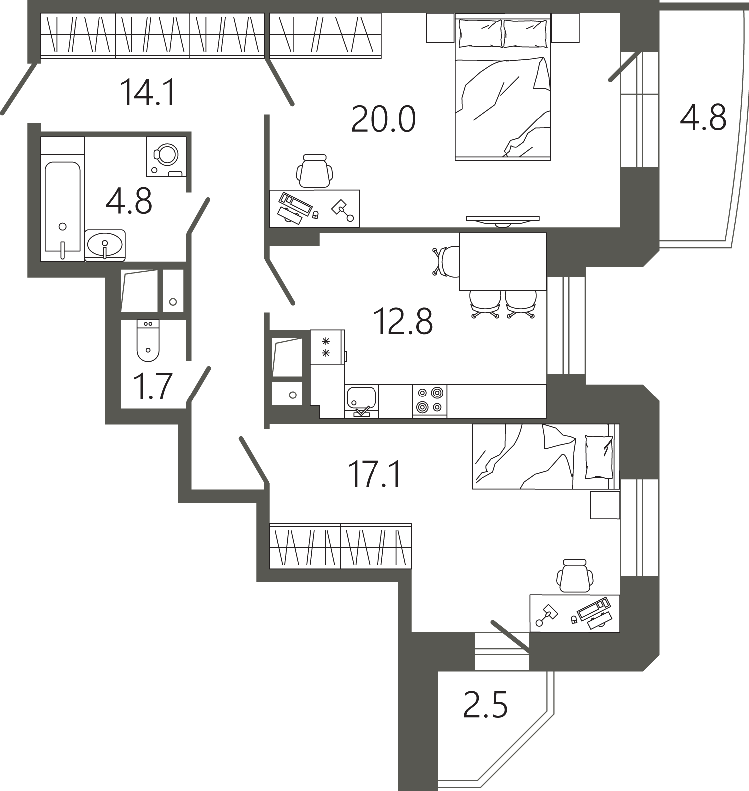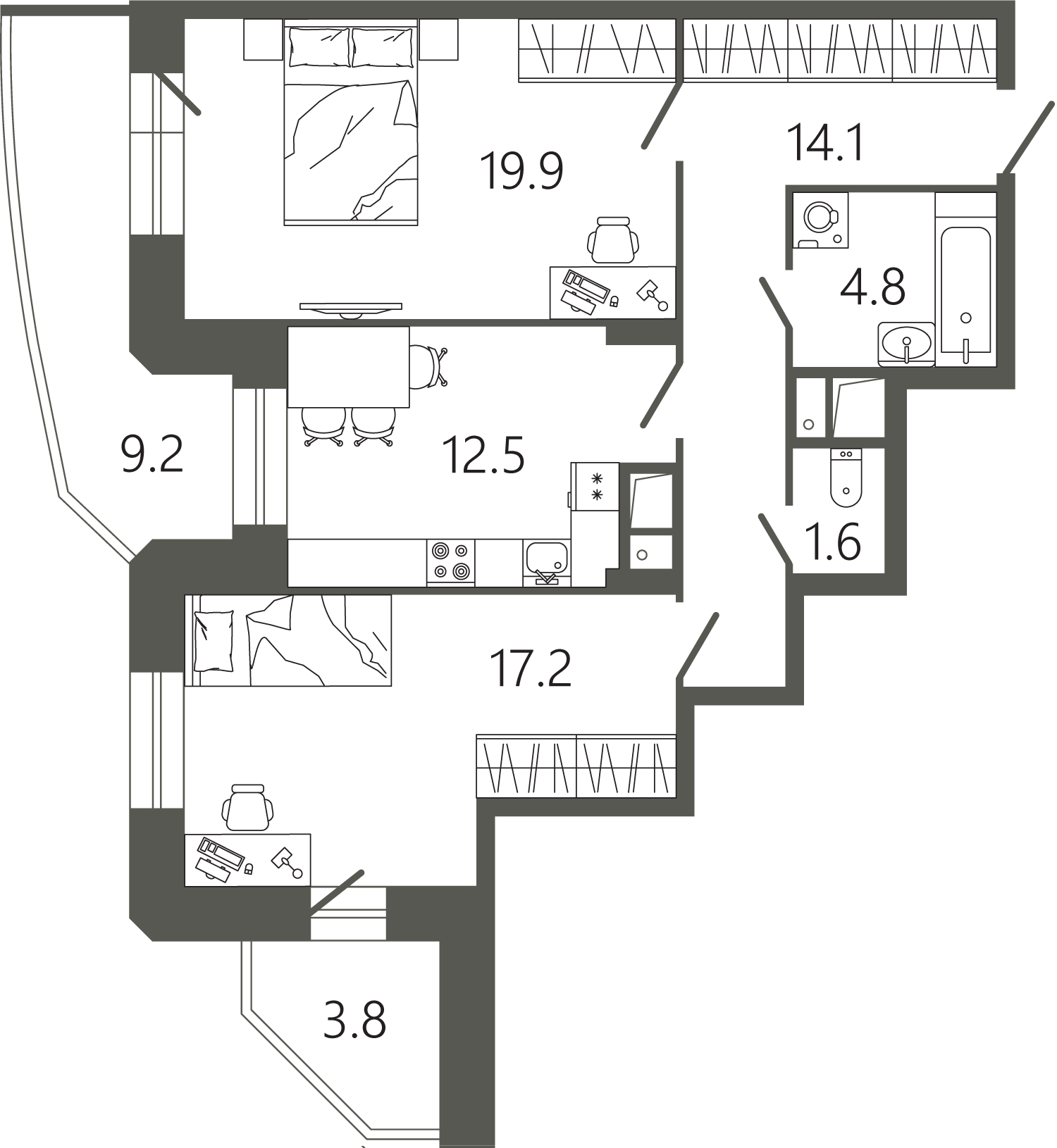 Просторные квартиры с одной, двумя и тремя комнатами, площадью от 45 до 97 кв. м, с тщательно продуманными планировками для максимальной эффективности использования пространства. Функциональность планировок позволяет максимально использовать пространство: кухня просторная, а холл может быть оформлен как гардеробная комната.