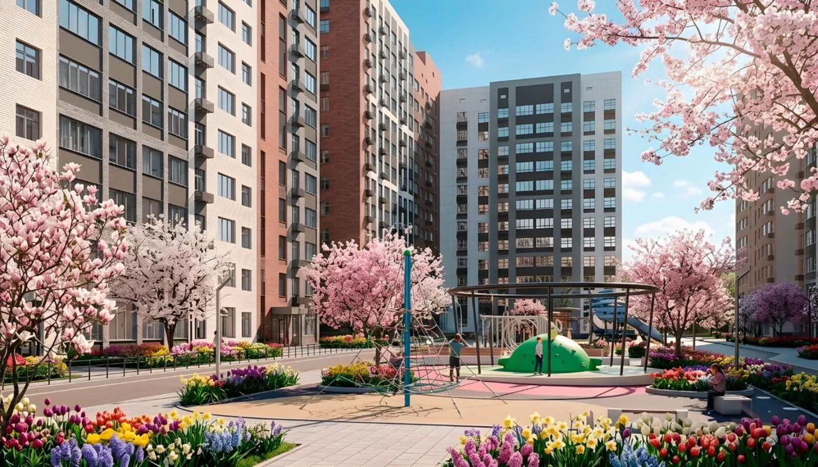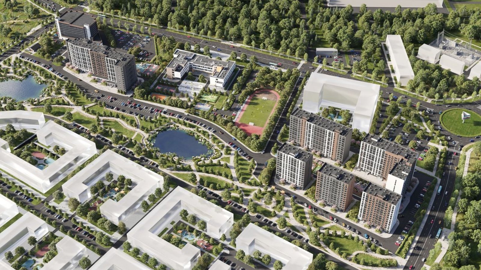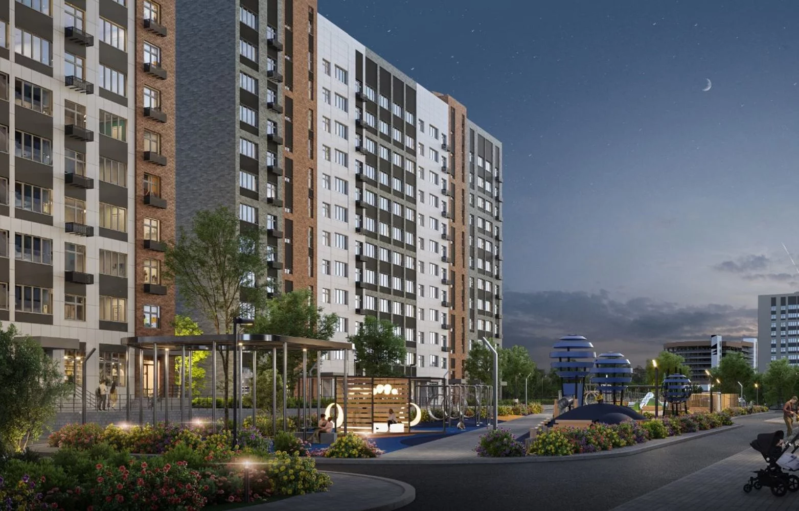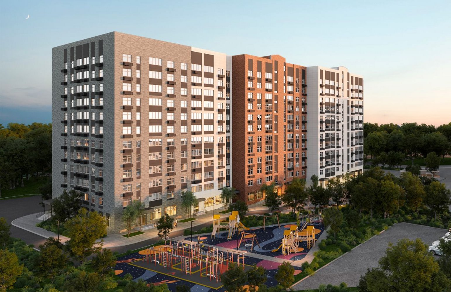 Опции, которые предлагает застройщик для проекта ЖК Троицкий: гостевая и многоуровневая парковки, коммерческие помещения на первом этаже, детские и спортивные площадки.