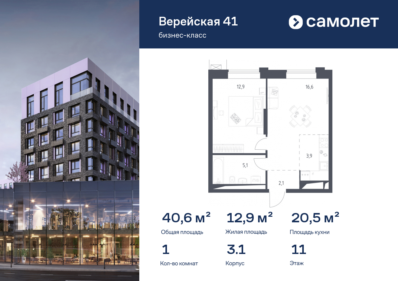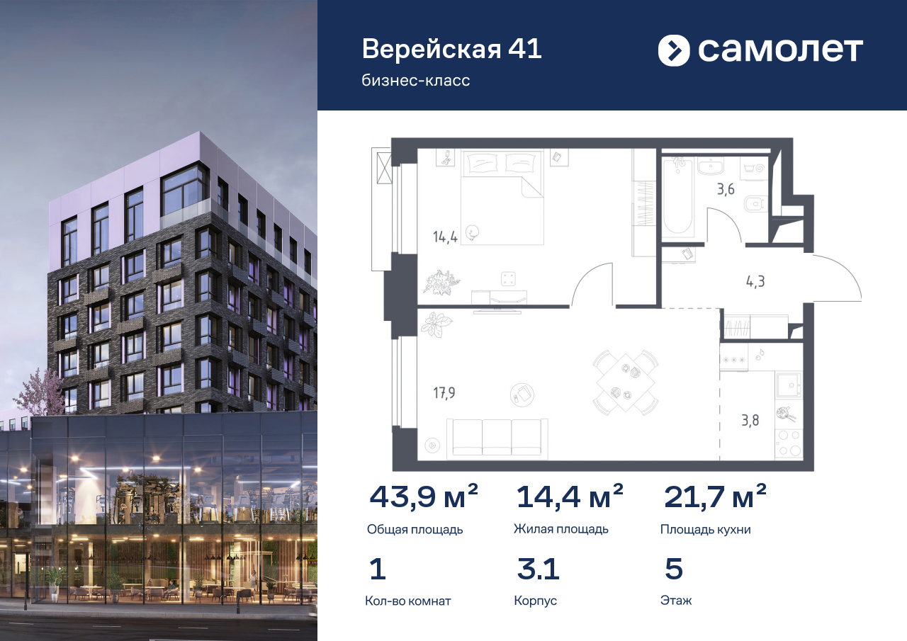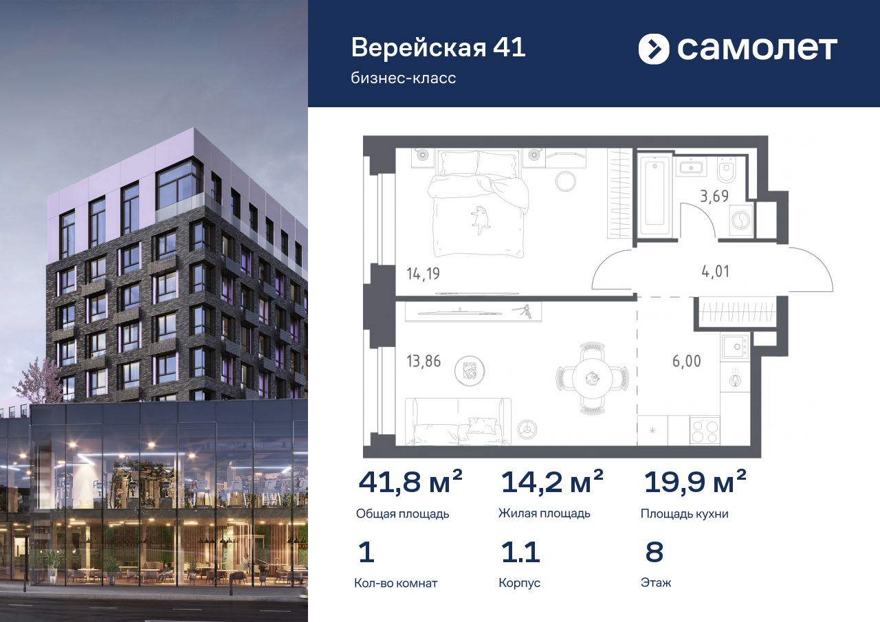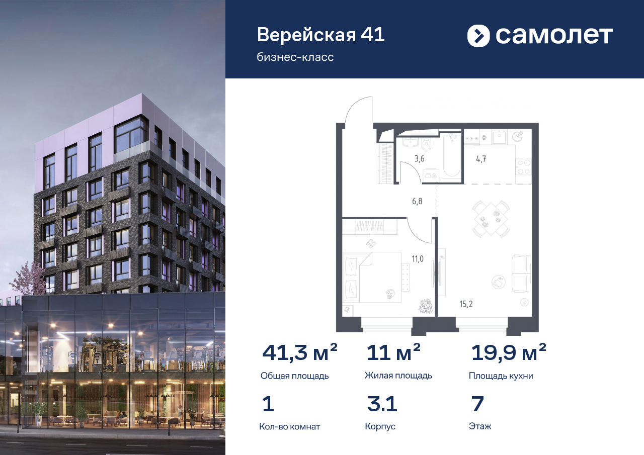 Жилой комплекс «Верейская 41» возводится застройщиком Группа "Самолёт". Проект бизнес-класса состоящий из 11 домов с высокими потолками. Здесь представлены как апартаменты с террасами, так и пентхаусы. С верхних этажей зданий открывается волшебный вид на воды реки Сетунь. Система "умного дома" поможет отказаться от переживаний о мелких бытовых моментах.
