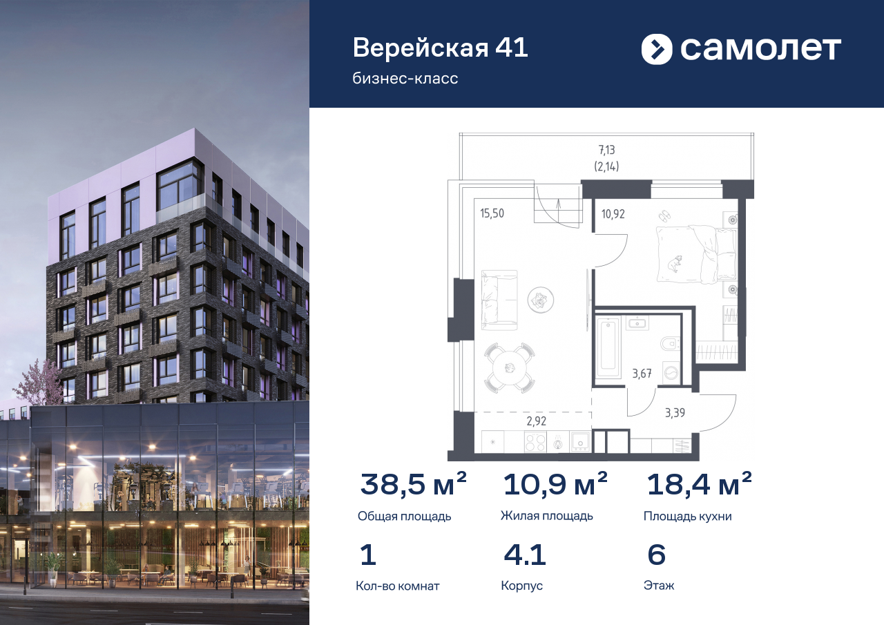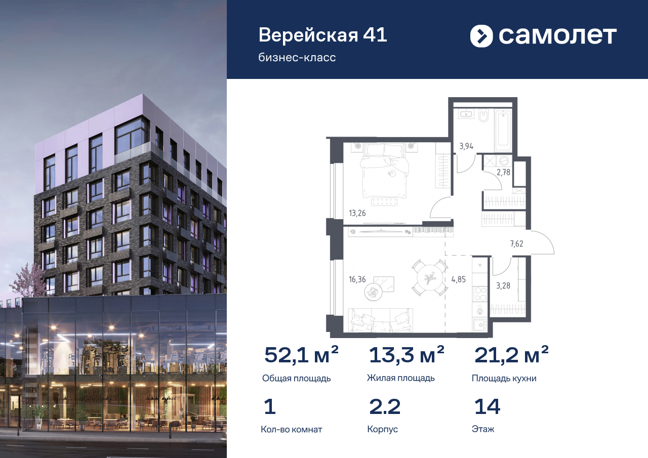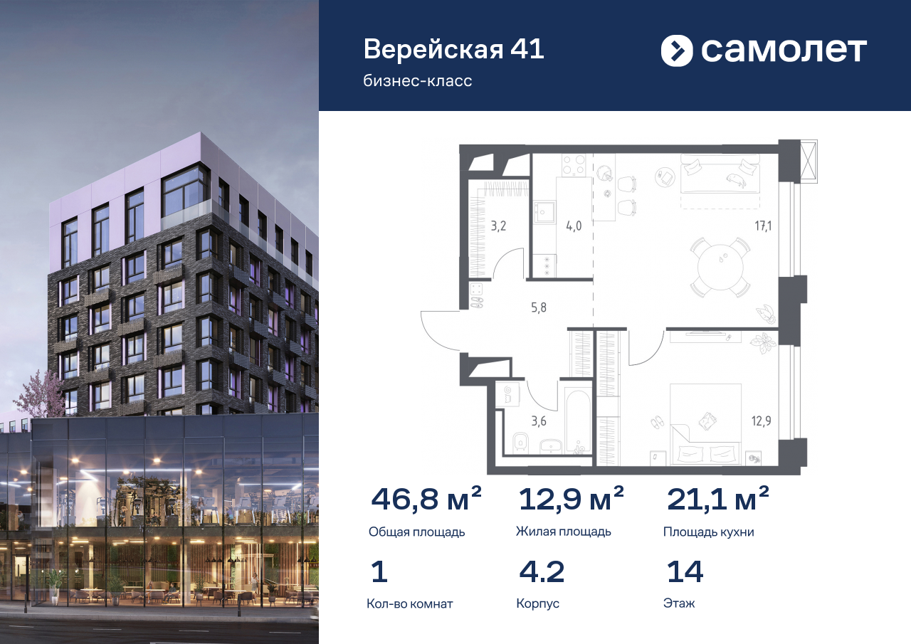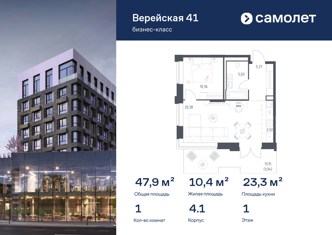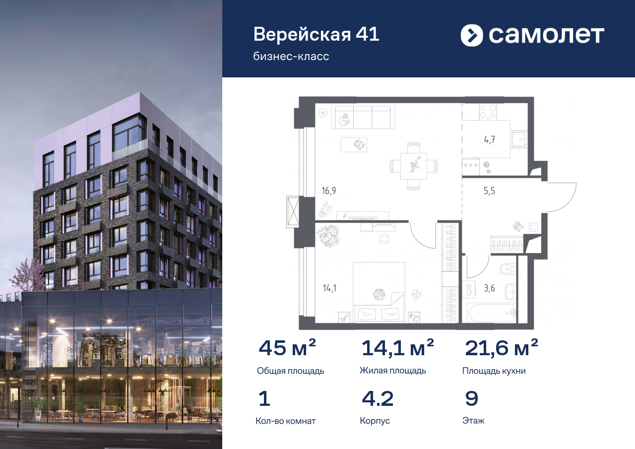 Жилой комплекс «Верейская 41» возводится застройщиком Группа "Самолёт". Проект бизнес-класса состоящий из 11 домов с высокими потолками. Здесь представлены как апартаменты с террасами, так и пентхаусы. С верхних этажей зданий открывается волшебный вид на воды реки Сетунь. Система "умного дома" поможет отказаться от переживаний о мелких бытовых моментах.