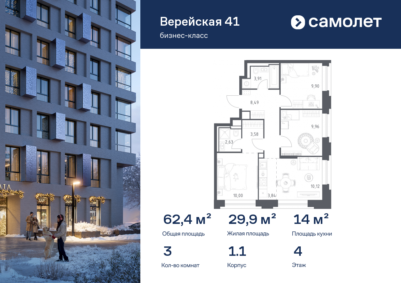 Жилой комплекс «Верейская 41» возводится застройщиком Группа "Самолёт". Проект бизнес-класса состоящий из 11 домов с высокими потолками. Здесь представлены как апартаменты с террасами, так и пентхаусы. С верхних этажей зданий открывается волшебный вид на воды реки Сетунь. Система "умного дома" поможет отказаться от переживаний о мелких бытовых моментах.