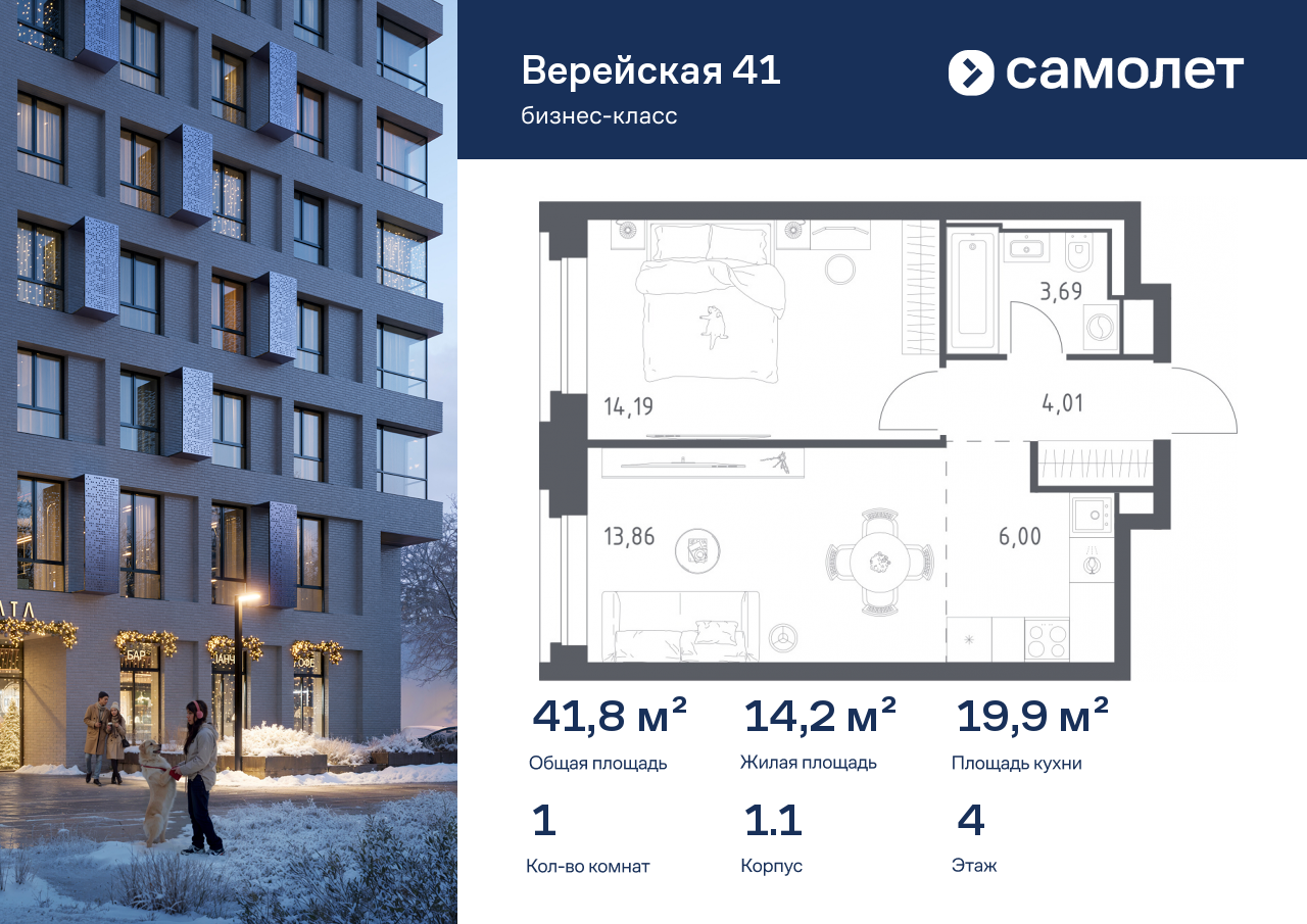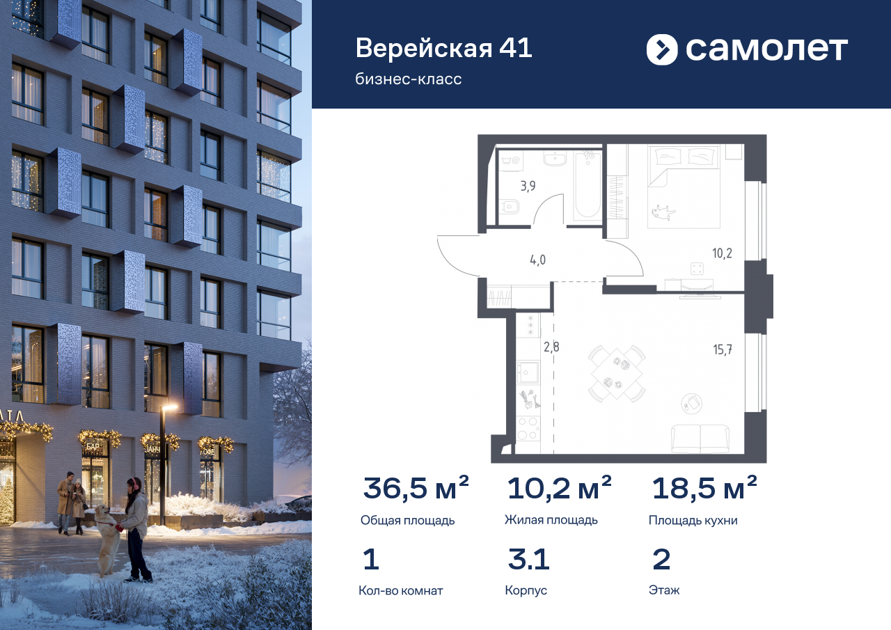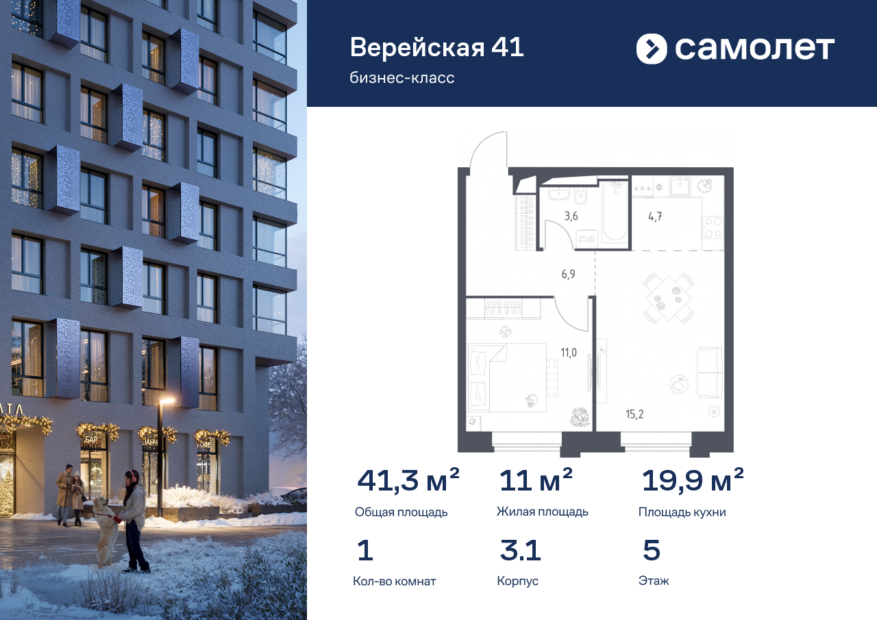 Жилой комплекс «Верейская 41» возводится застройщиком Группа "Самолёт". Проект бизнес-класса состоящий из 11 домов с высокими потолками. Здесь представлены как апартаменты с террасами, так и пентхаусы. С верхних этажей зданий открывается волшебный вид на воды реки Сетунь. Система "умного дома" поможет отказаться от переживаний о мелких бытовых моментах.