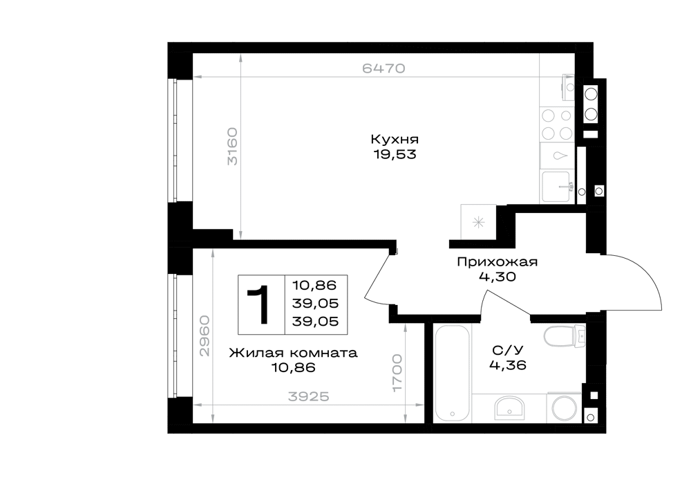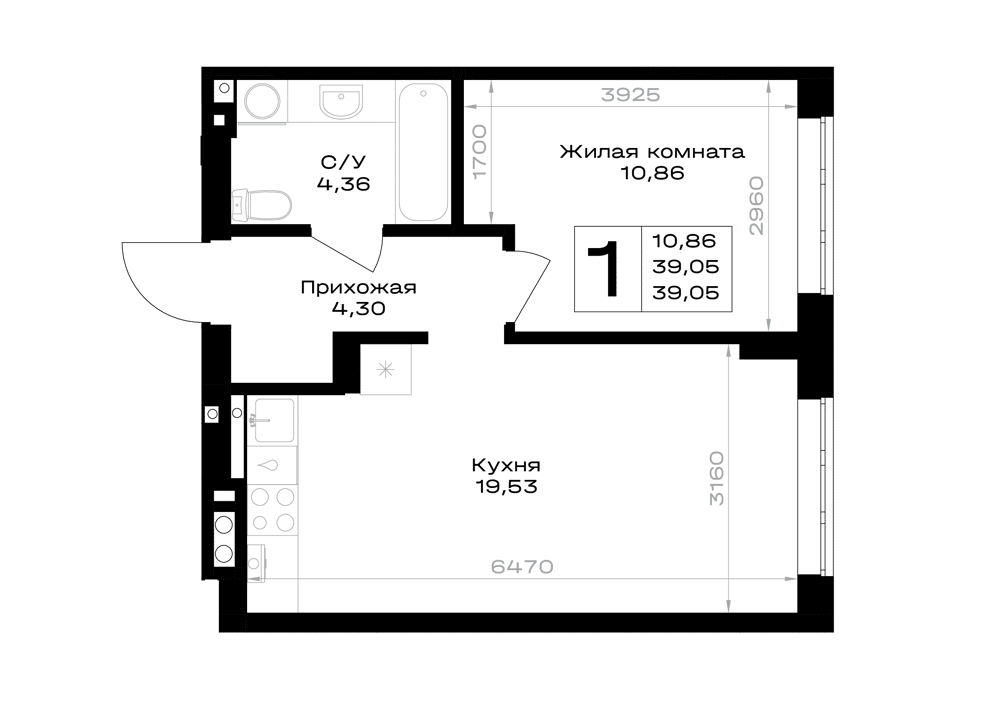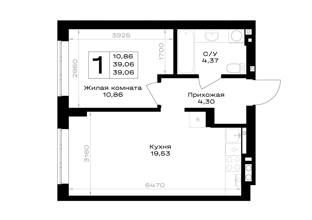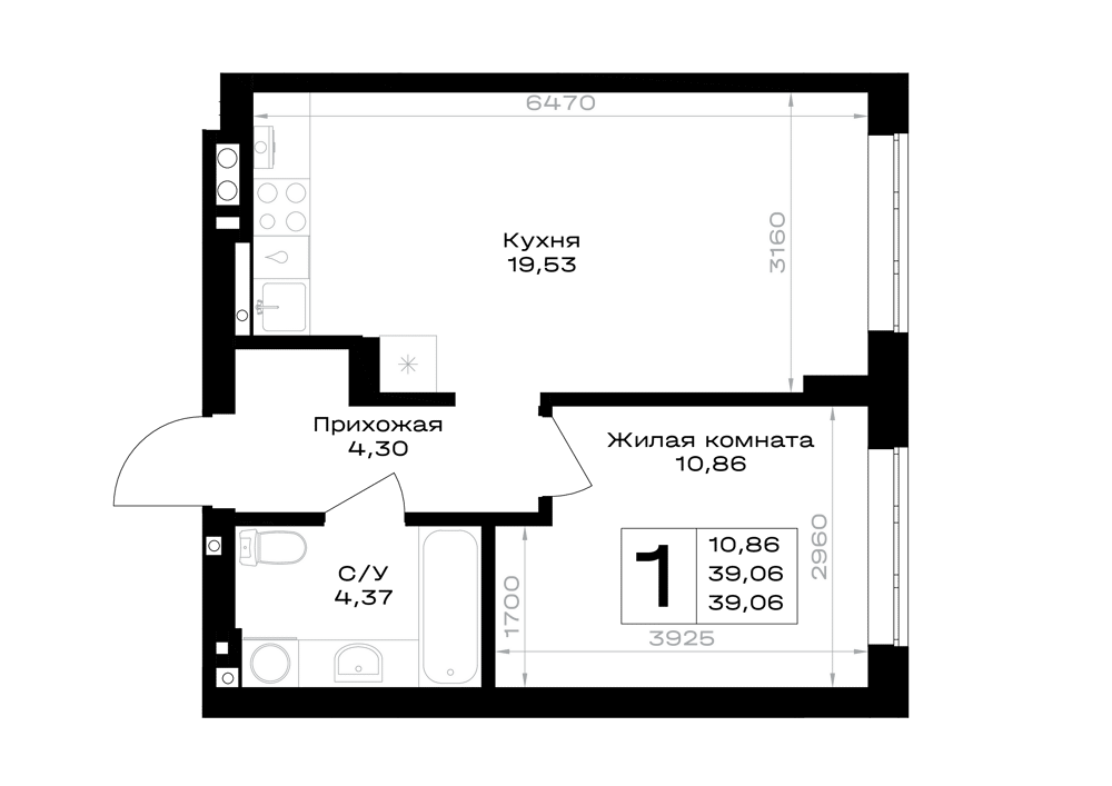 Евро 1-комнатная (39.06м2)