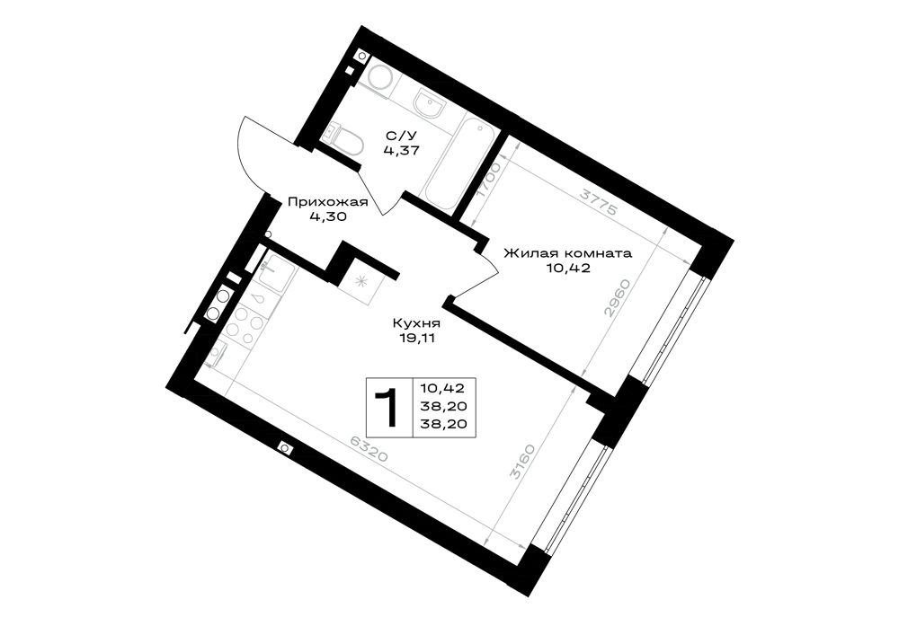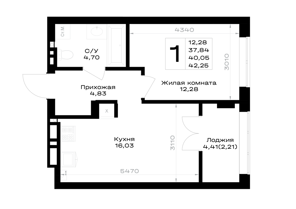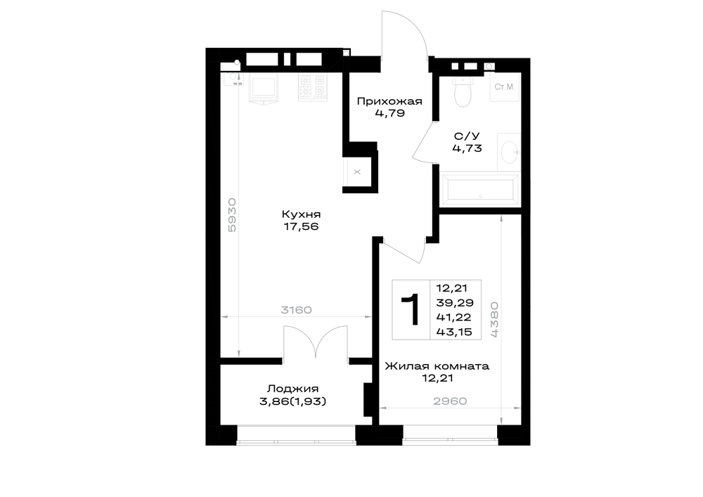 Евро 1-комнатная (41.22м2)