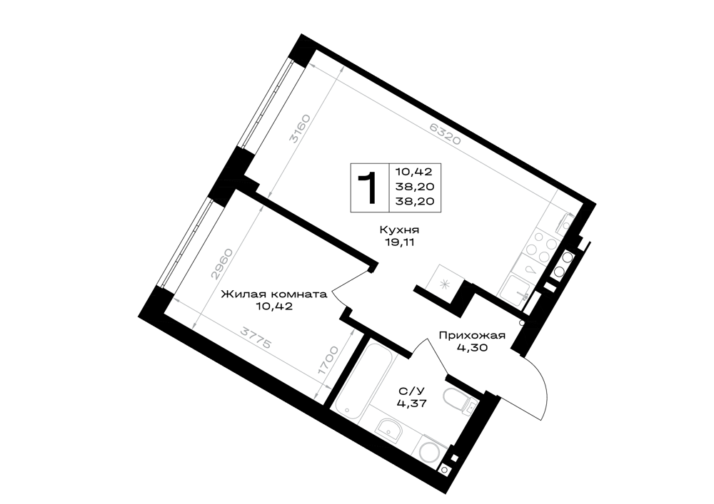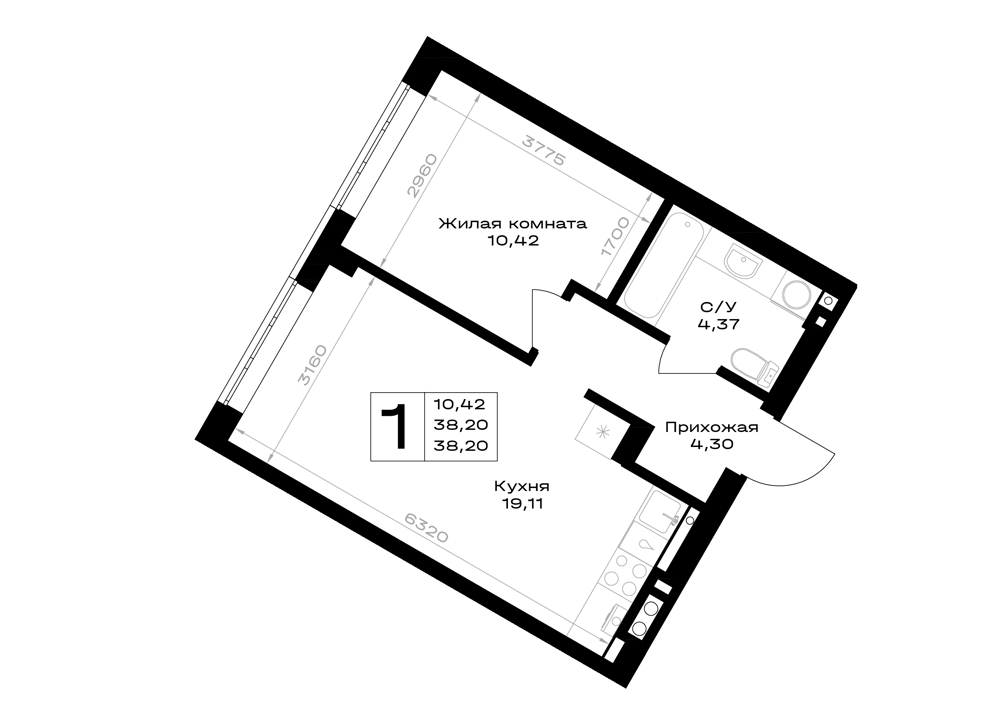 Евро 1-комнатная (38.2м2)