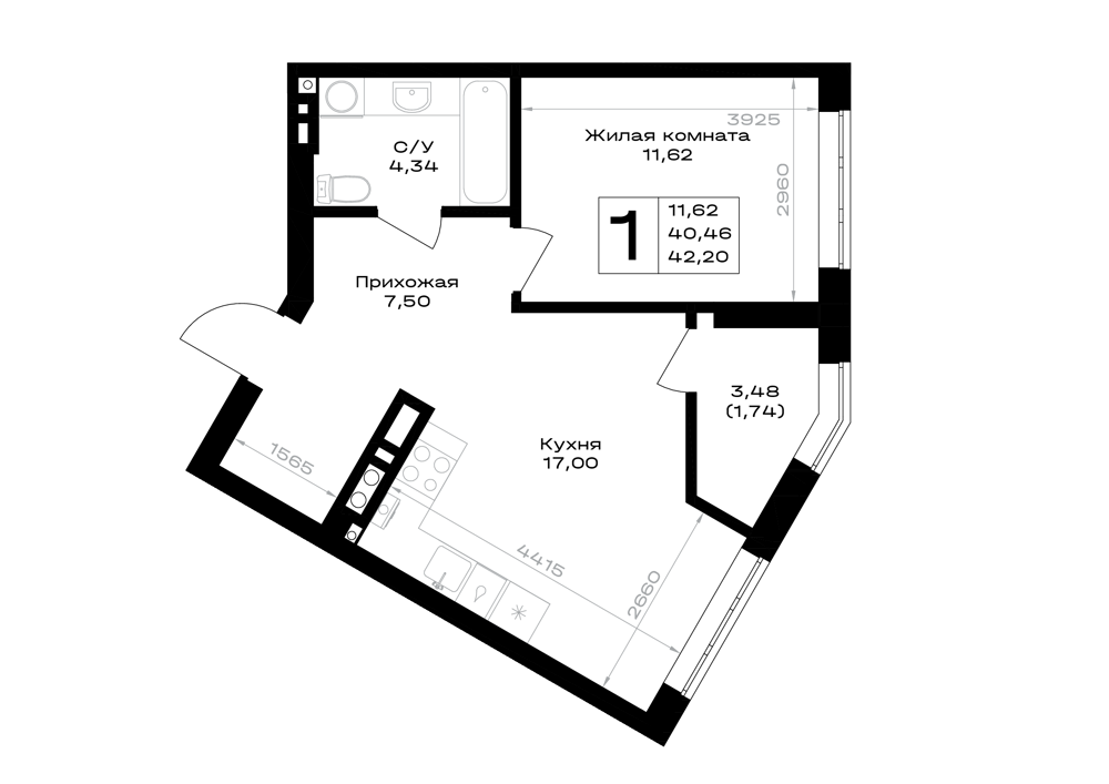 Евро 1-комнатная (42.2м2)
