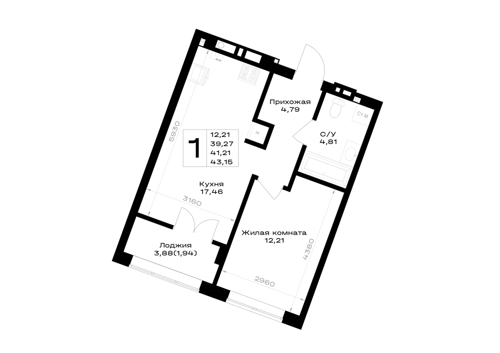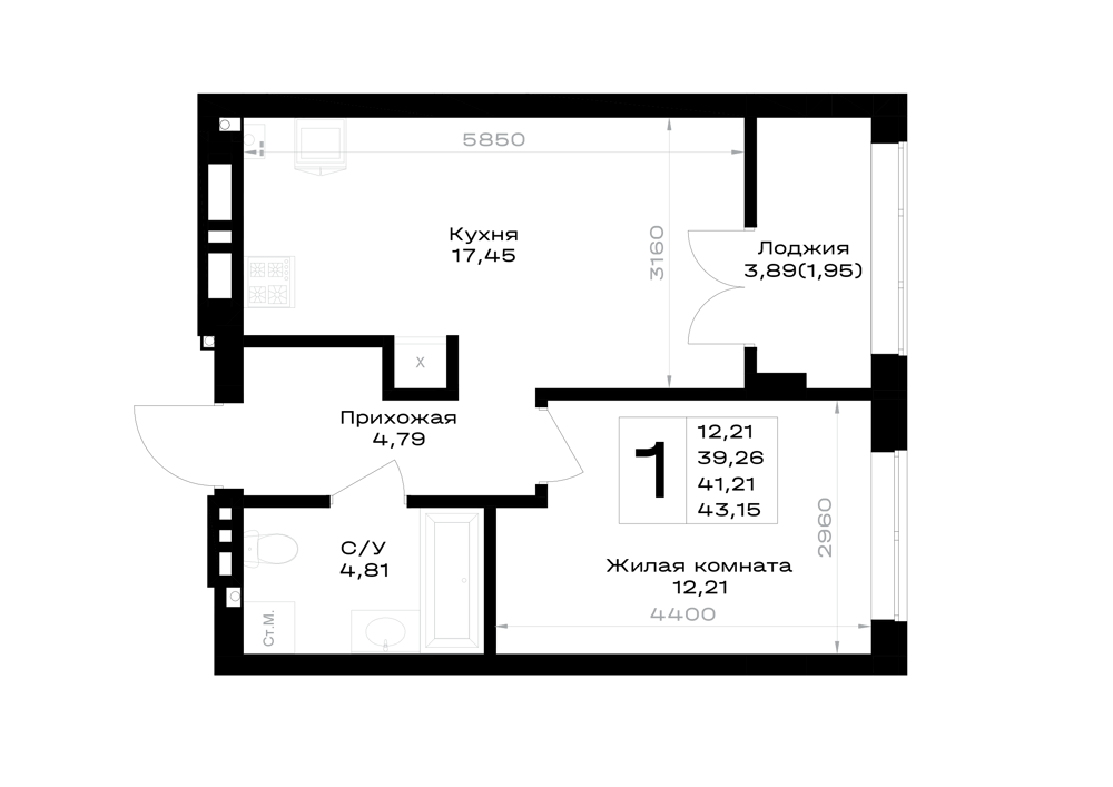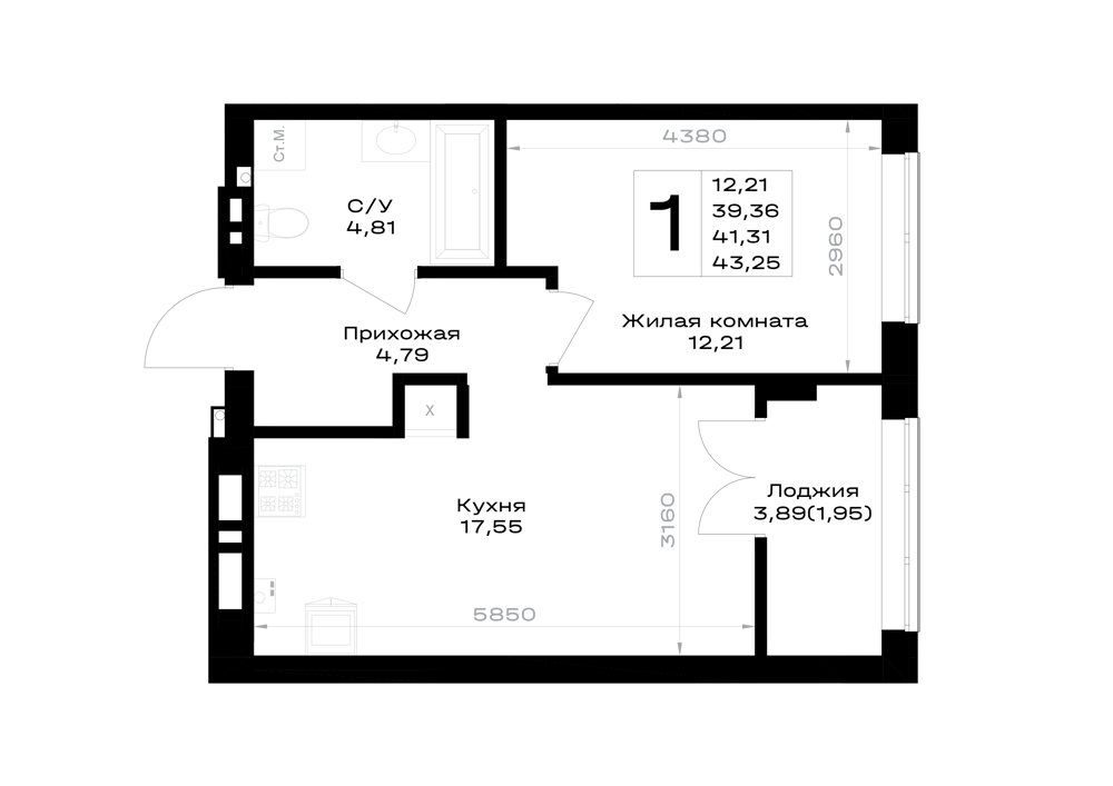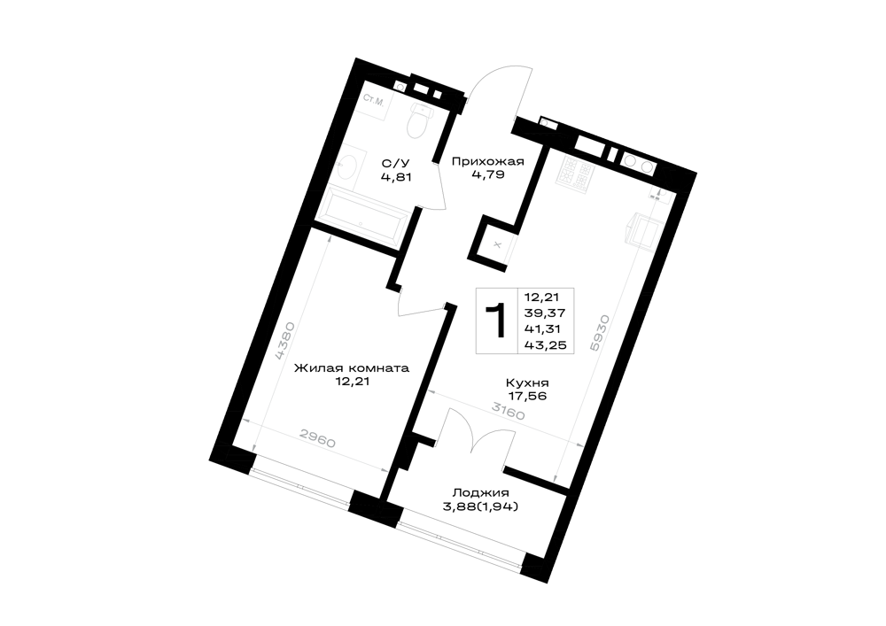 Евро 1-комнатная (41.21м2)
