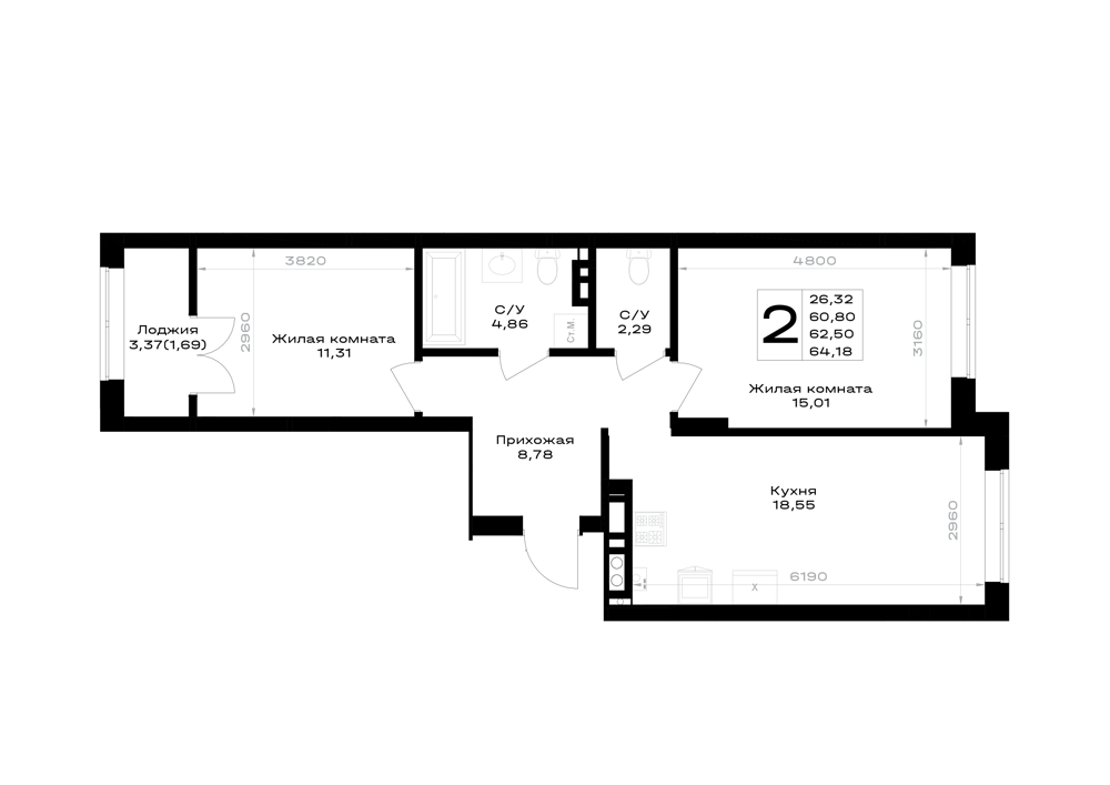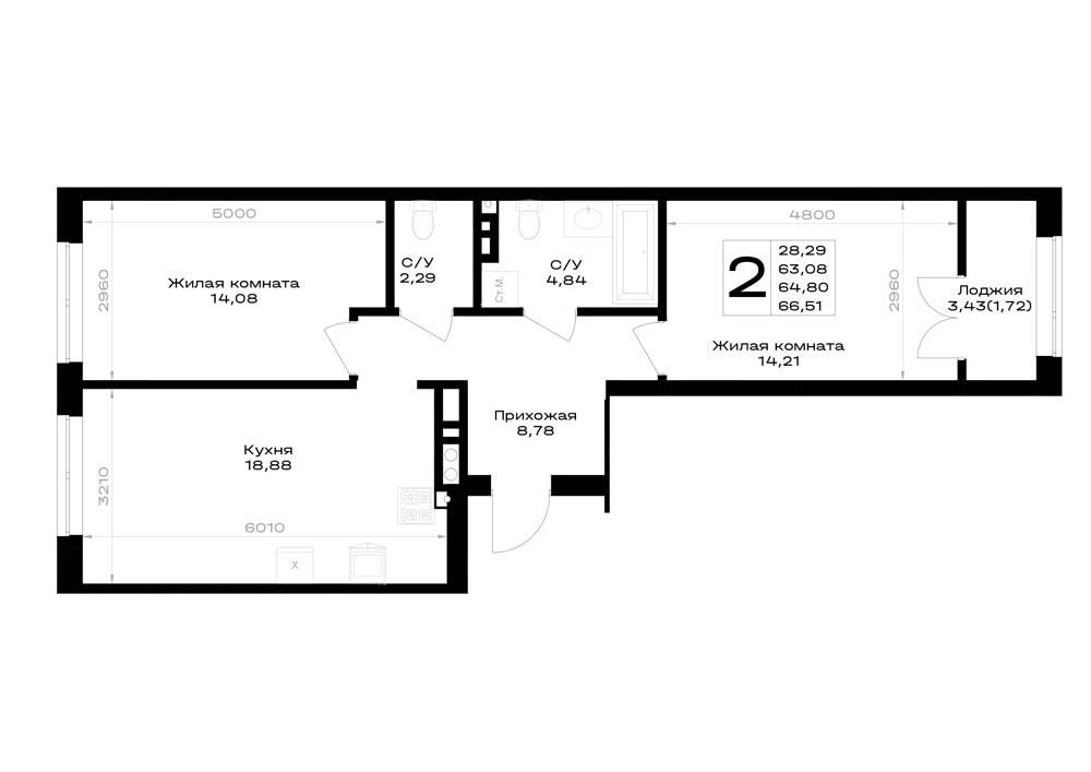 Евро 2-комнатная (63.05м2)