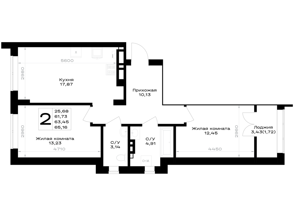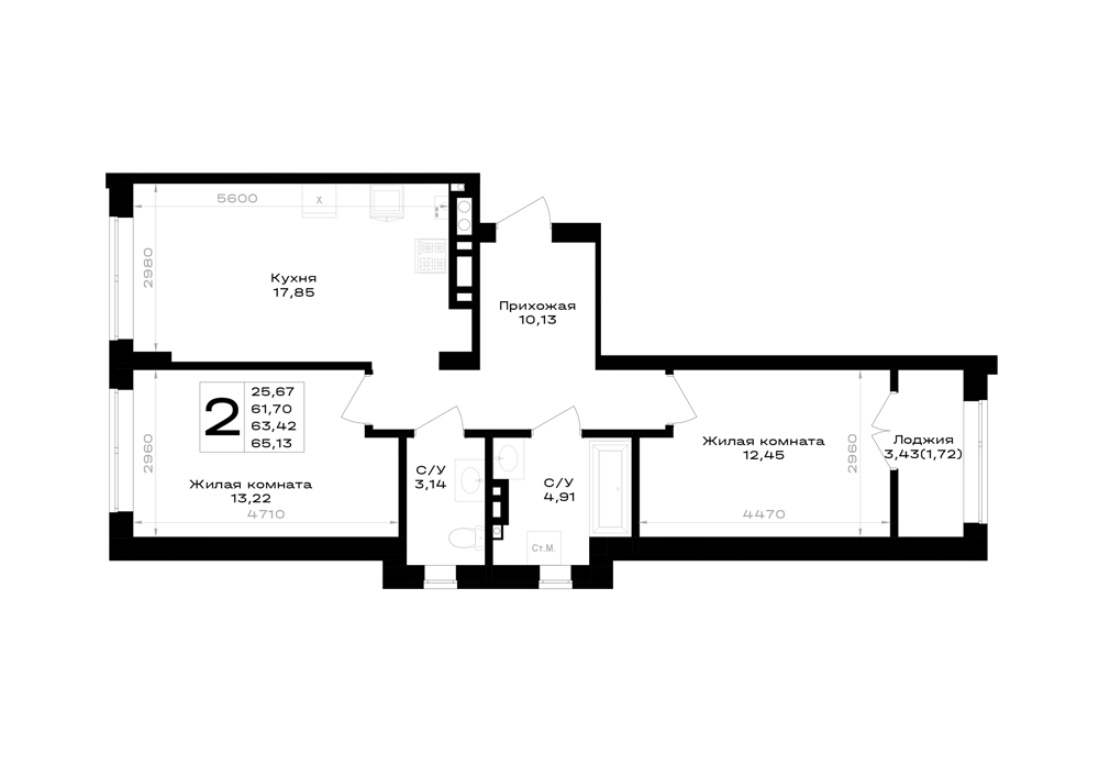 Евро 2-комнатная (63.45м2)