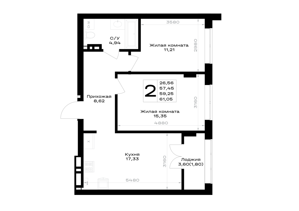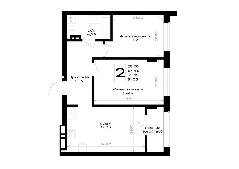 Евро 2-комнатная (59.31м2)