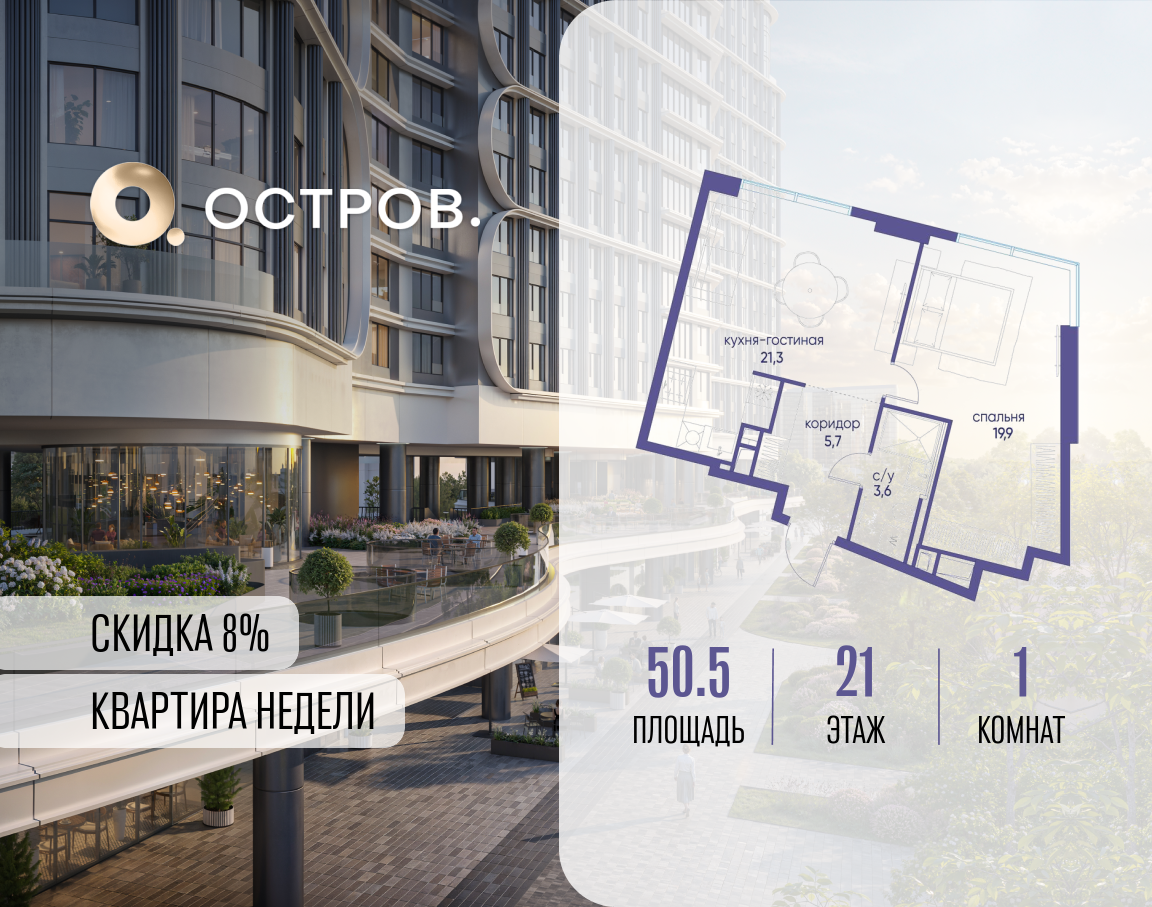 В «Острове» предлагается широкий выбор квартир: от небольших уютных студий до элитных резиденций. Также есть пентхаусы и квартиры с террасами, угловым остеклением, окнами в ванных, возможностью установить камин.