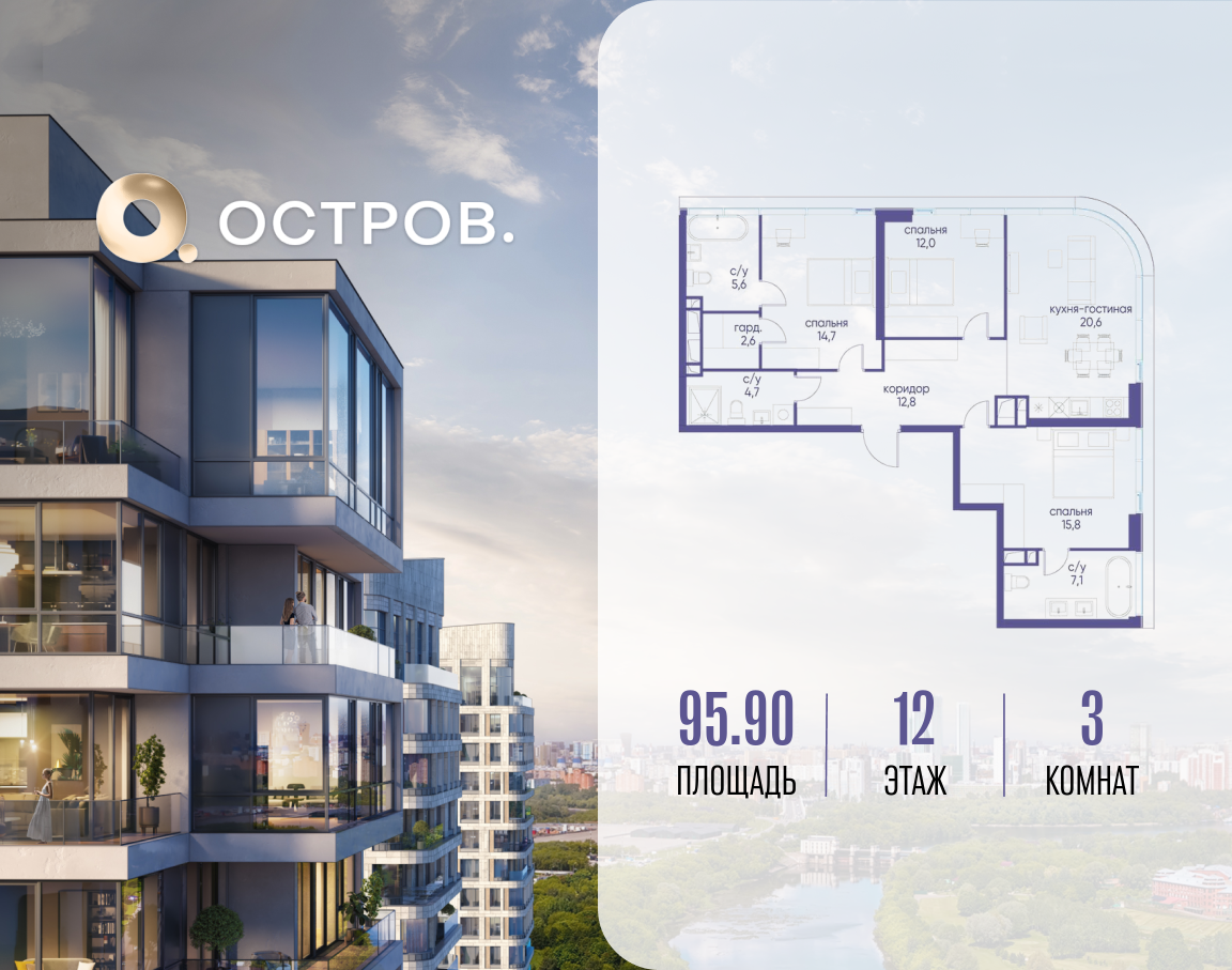 В «Острове» предлагается широкий выбор квартир: от небольших уютных студий до элитных резиденций. Также есть пентхаусы и квартиры с террасами, угловым остеклением, окнами в ванных, возможностью установить камин.