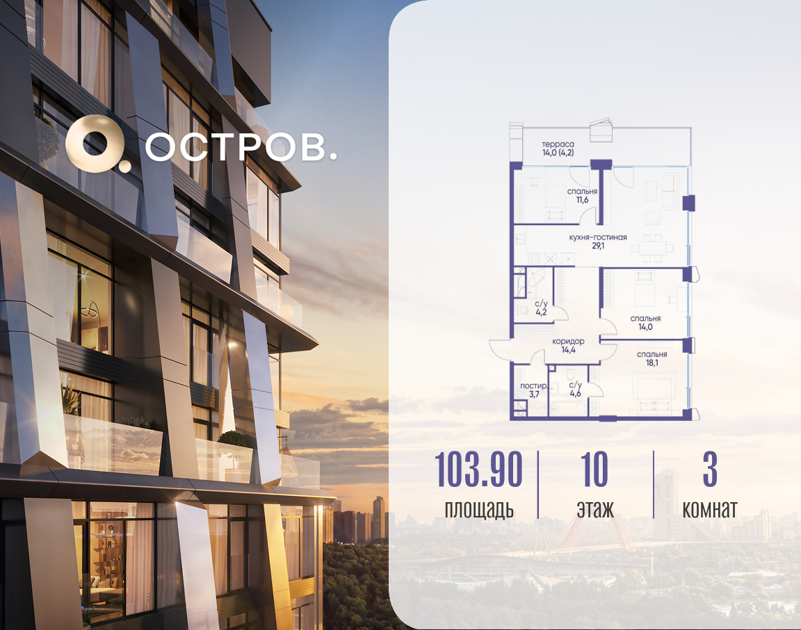 В «Острове» предлагается широкий выбор квартир: от небольших уютных студий до элитных резиденций. Также есть пентхаусы и квартиры с террасами, угловым остеклением, окнами в ванных, возможностью установить камин.