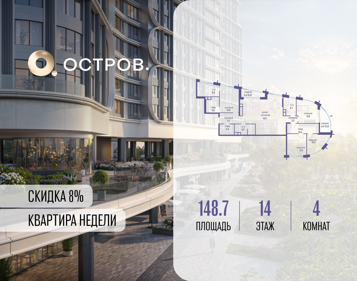 В «Острове» предлагается широкий выбор квартир: от небольших уютных студий до элитных резиденций. Также есть пентхаусы и квартиры с террасами, угловым остеклением, окнами в ванных, возможностью установить камин.
