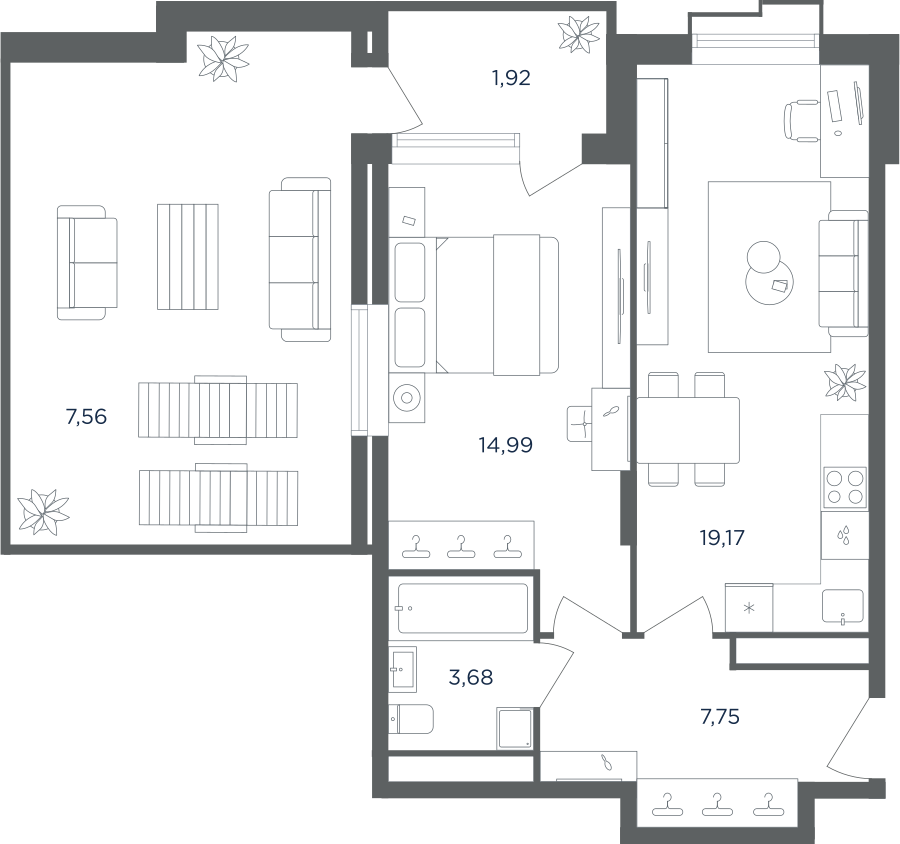 Покупатели могут выбрать квартиры разных площадей и планировок. Это могут быть как квартиры, так и апартаменты площадью от 27 до 93 кв. м. Среди предложений есть квартиры евроформата. На последних этажах у всех квартир имеются видовые террасы. А в распоряжении жителей первых этажей — собственные участки придомовой территории.