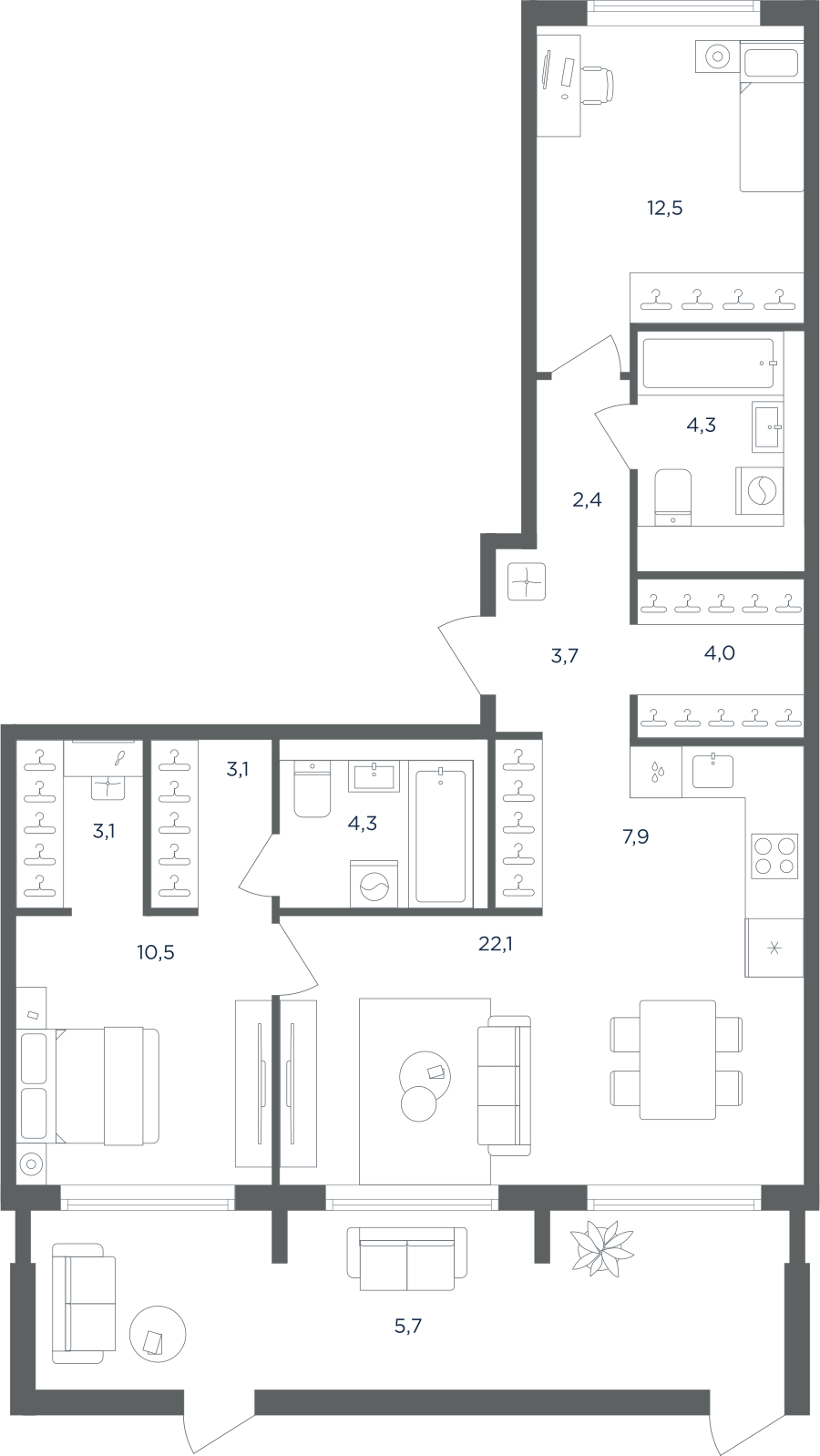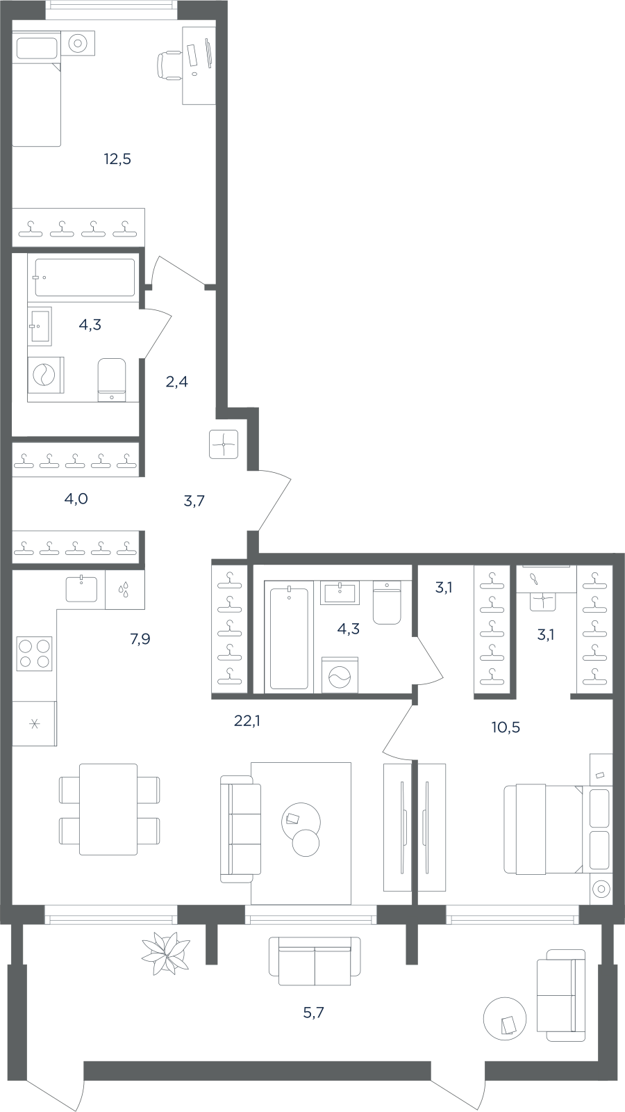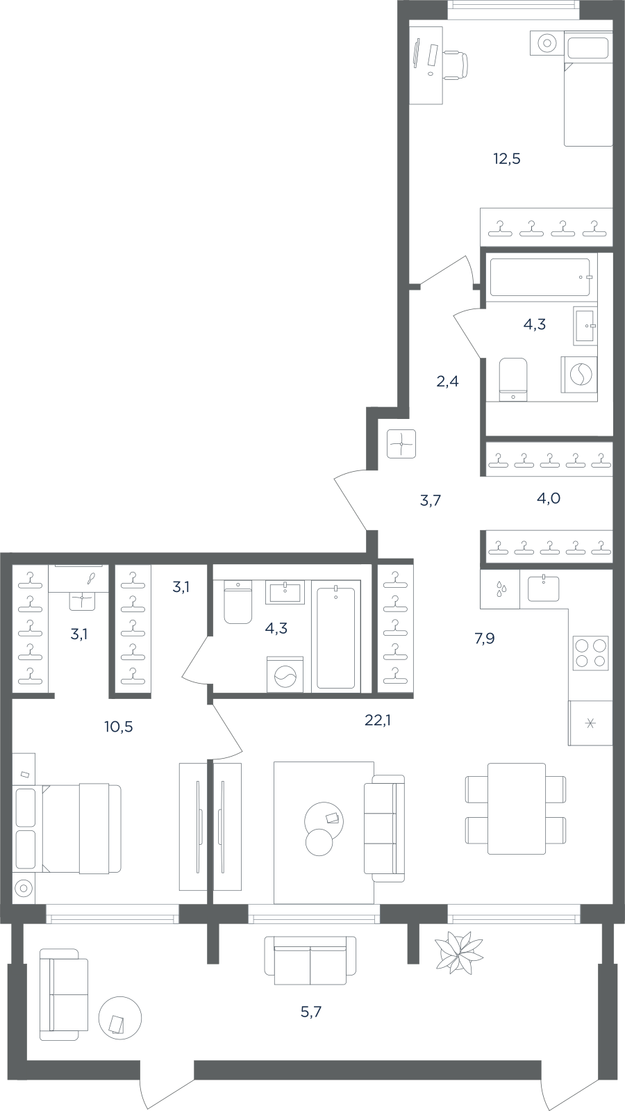 Покупатели могут выбрать квартиры разных площадей и планировок. Это могут быть как квартиры, так и апартаменты площадью от 27 до 93 кв. м. Среди предложений есть квартиры евроформата. На последних этажах у всех квартир имеются видовые террасы. А в распоряжении жителей первых этажей — собственные участки придомовой территории.