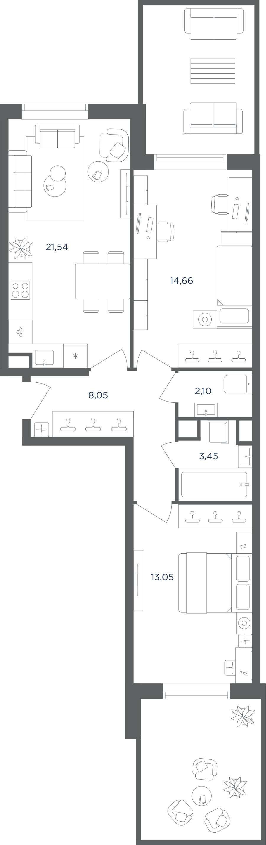 Покупатели могут выбрать квартиры разных площадей и планировок. Это могут быть как квартиры, так и апартаменты площадью от 27 до 93 кв. м. Среди предложений есть квартиры евроформата. На последних этажах у всех квартир имеются видовые террасы. А в распоряжении жителей первых этажей — собственные участки придомовой территории.
