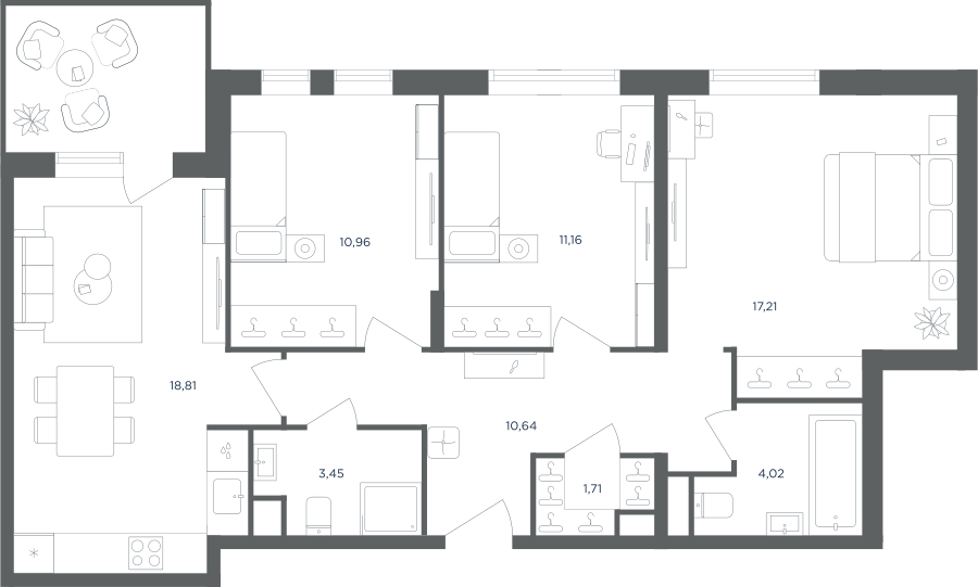 Покупатели могут выбрать квартиры разных площадей и планировок. Это могут быть как квартиры, так и апартаменты площадью от 27 до 93 кв. м. Среди предложений есть квартиры евроформата. На последних этажах у всех квартир имеются видовые террасы. А в распоряжении жителей первых этажей — собственные участки придомовой территории.